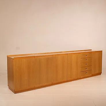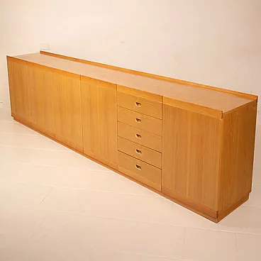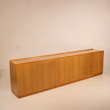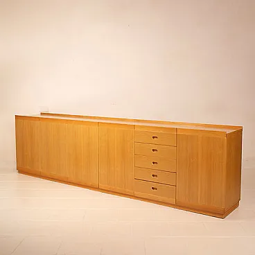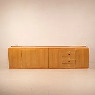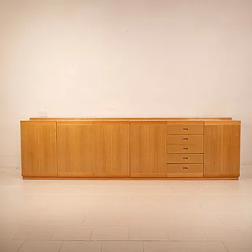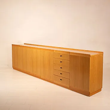 La credenza è lunga e bassa, ideale per ambienti living o uffici di design, e si compone di più vani chiusi da ante e di una serie di cassetti centrali con maniglie a incavo, che garantiscono praticità senza alterare l’estetica minimalista.