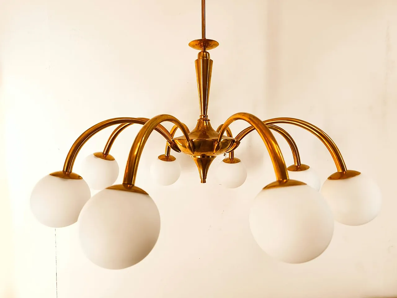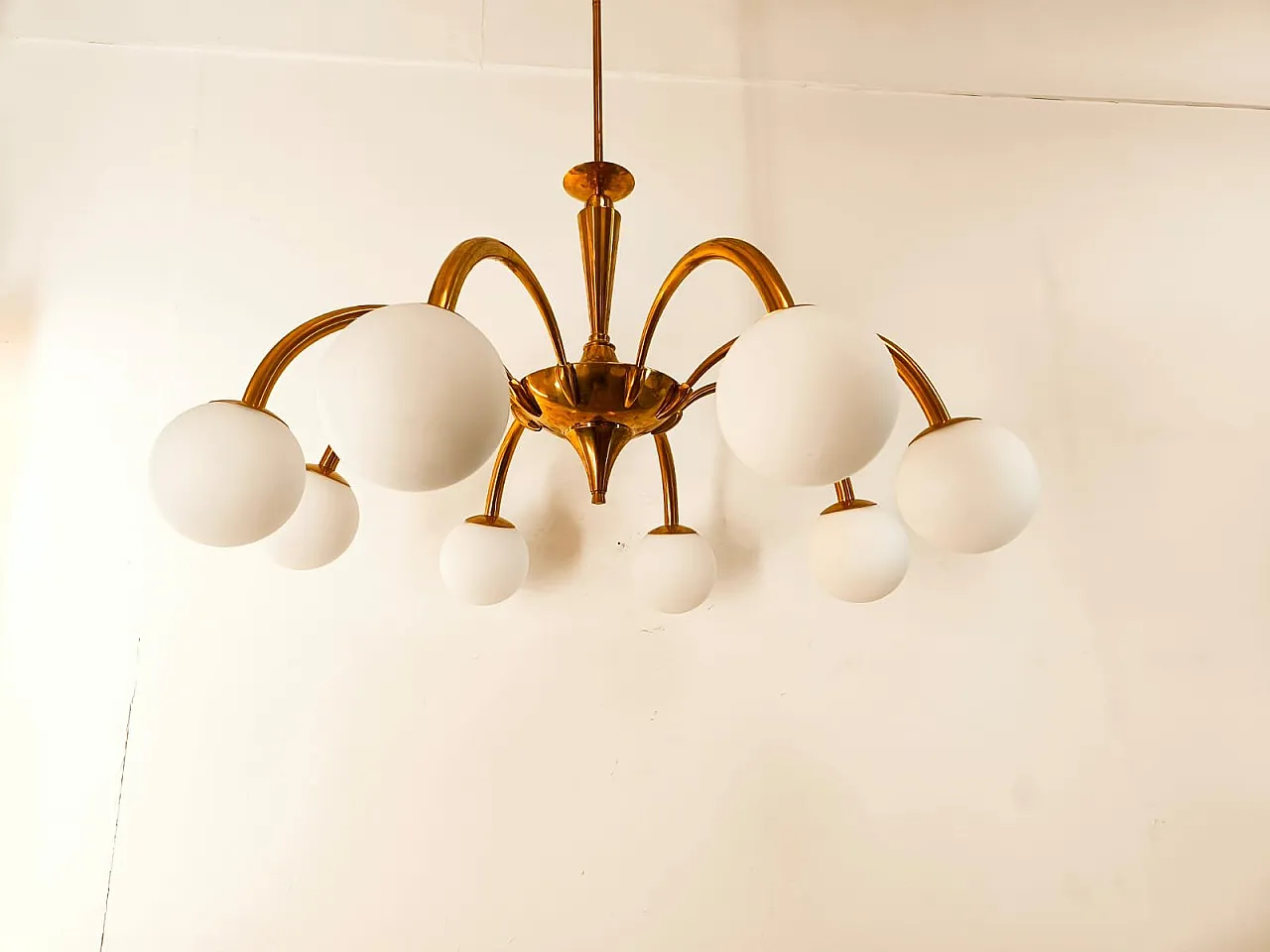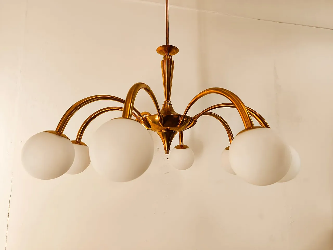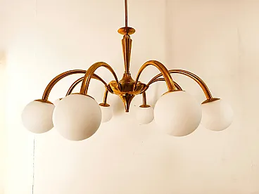 Lampadario a 8 luci in ottone con sfere in vetro, anni '60