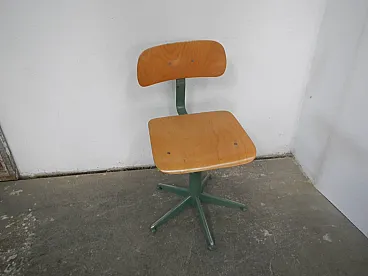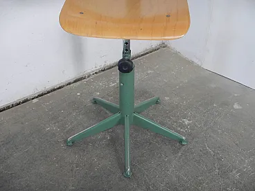 Sgabello in ferro verde 5 gambe con schienale e seduta in laminato di faggio. Lo schienale è reclinabile. La seduta misura cm 40x40. Regolabile manualmente da cm 61 a cm 47