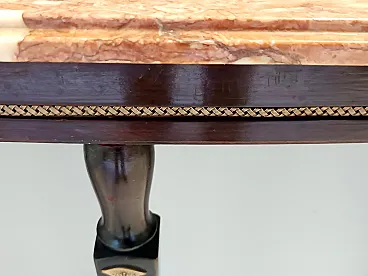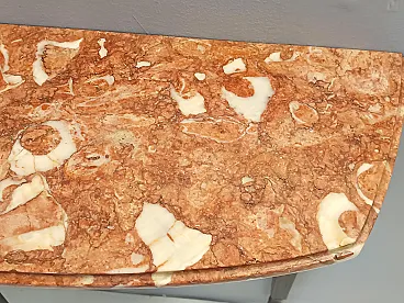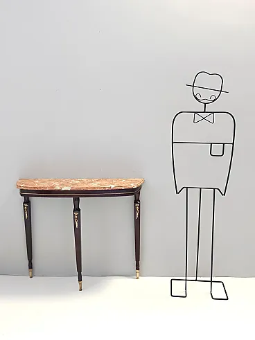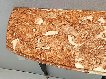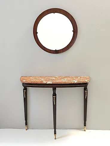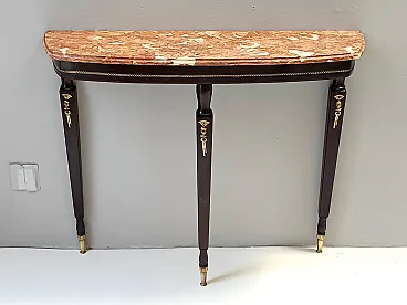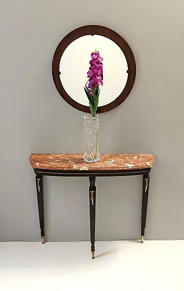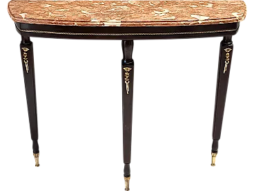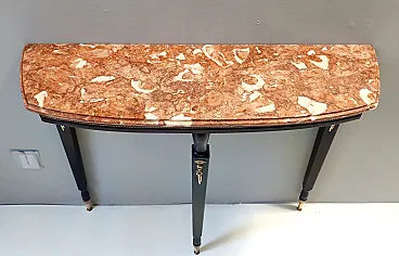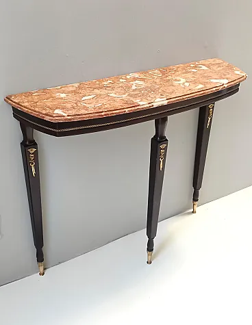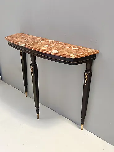 Made in Italy, 1950s. This console table has an ebonized beech frame with brass details and an orange Breccia Pernice marble top. This very elegant console may show slight traces of use since it's vintage, but it can be considered as in excellent original condition and ready to become a piece in a home. Measures: Width 100 cm Depth 30 cm Height 83 cm. Order it now! We sell the best quality pieces and we offer an amazing service: if it's not during night time, we answer within 2 hours and we absolutely love to follow every step of the purchase and even after. As matter of fact we really appreciate our customers’ feedback and when we receive pictures of our pieces in their new homes. We assist you during the process and answer all your questions. In addition to this, we always review the pieces before shipping, so that you receive the goods at its very best. We provide the best possible quotes and professionally and carefully pack the items. Insurance is included. And if there is any issue, it is our mission to make so you don't have to worry: we will always be there for you to assist in any way possible.