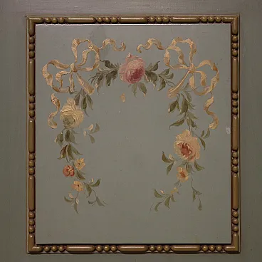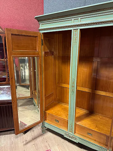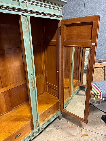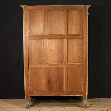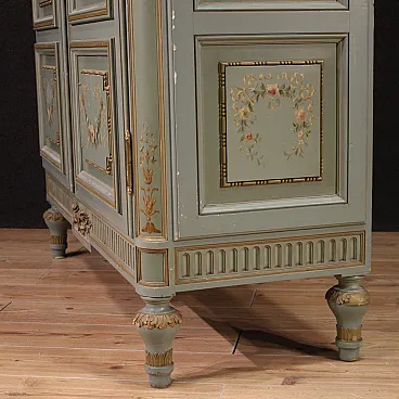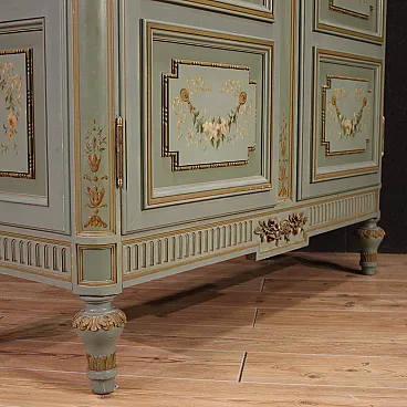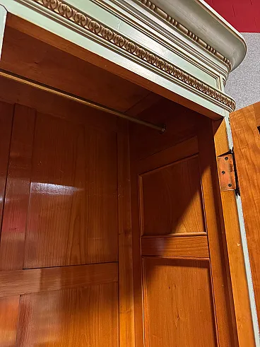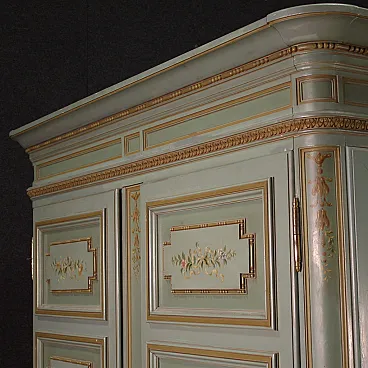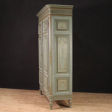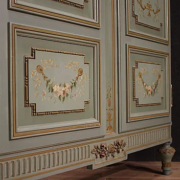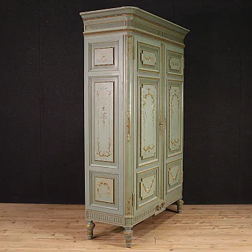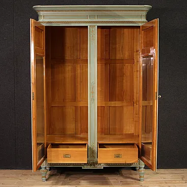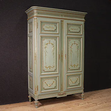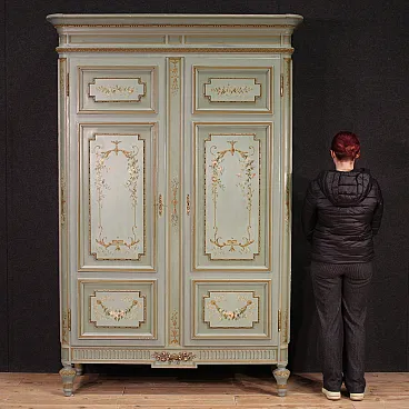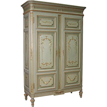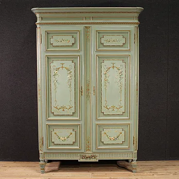 Grande armadio italiano della metà del XX secolo. Mobile in stile Luigi XVI di eccezionale qualità, in legno scolpito, laccato e dipinto a mano con decori floreali. Armadio a due ante di ottima capacità, ideale per riporre giacche e cappotti. Troviamo al suo interno una sbarra in metallo appendiabiti, due capienti cassetti e il piano a basamento, di ottimo servizio. Ante complete di specchi incassati interni di grande utilità. Mobile dal peso considerevole, costruito in un unico corpo non smontabile (solo le due ante sono separabili dalla struttura dell’armadio). Presenta piccoli graffi e segni di usura (vedi foto). Strutturalmente impeccabile e completo di una chiave funzionante. Mobile nel complesso in buono stato conservativo.