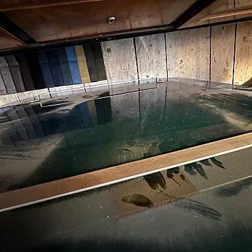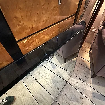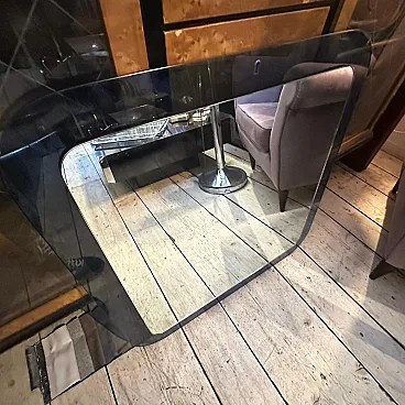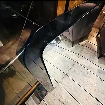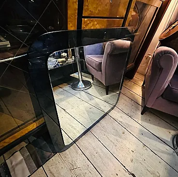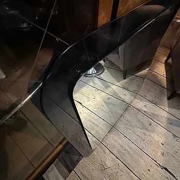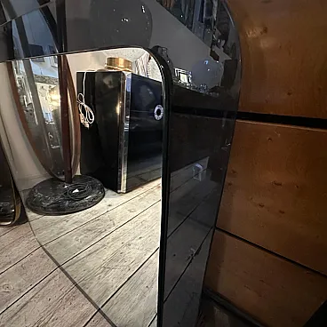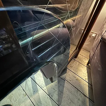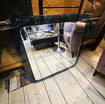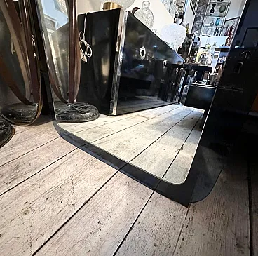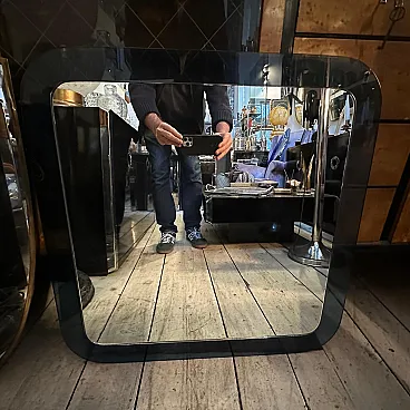 Un incredibile specchio da parete quadrato progettato e prodotto in Italia da Lupi Cristal Luxor. Lo specchio è un pezzo distintivo ed elegante che riflette le tendenze innovative del design dell'epoca. Lo specchio ha una forma quadrata con angoli arrotondati, che gli conferiscono un aspetto morbido e moderno. Presenta un design elegante e minimalista, tipico dell'estetica A Space Age degli anni '70, ed è realizzato in vetro di alta qualità, che garantisce chiarezza e durata. Combina un vetro colorato di blu con un vetro a specchio trasparente, creando un contrasto visivo sorprendente, la tinta blu aggiunge un sottile tocco di colore e di calore. I bordi dello specchio sono lisci e levigati, a dimostrazione dell'alto livello di artigianalità. Lo specchio è stato progettato per essere montato a parete, con una robusta ferramenta di montaggio che ne garantisce il fissaggio. Il suo design gli permette di essere un punto focale in qualsiasi stanza, migliorando l'arredamento generale con il suo stile unico. Lo specchio è di dimensioni moderate, il che lo rende abbastanza versatile da poter essere utilizzato in vari spazi come soggiorni, bagni o corridoi. Le sue dimensioni sono proporzionate e offrono un'ampia superficie riflettente senza essere eccessivamente dominanti. Pur essendo principalmente decorativo, lo specchio è anche funzionale e fornisce un riflesso chiaro per l'uso quotidiano. Il suo design Space Age lo rende un oggetto di conversazione e un'elegante aggiunta agli interni moderni di metà secolo.