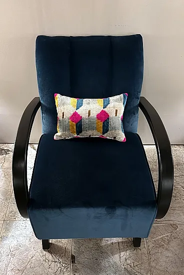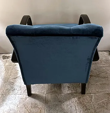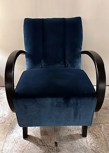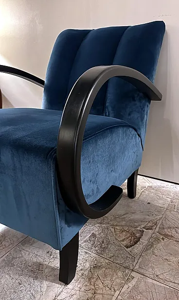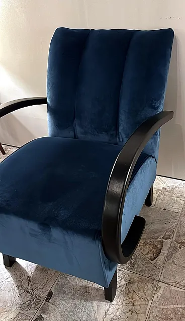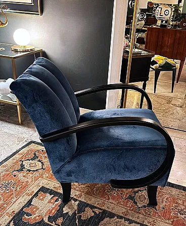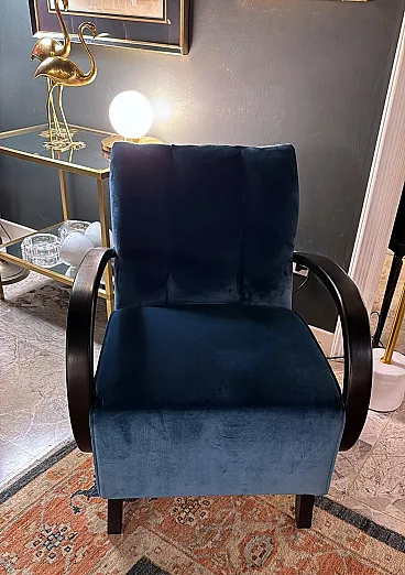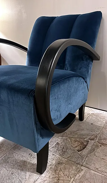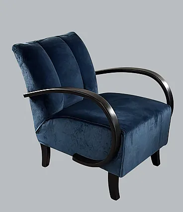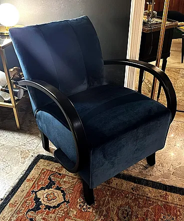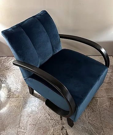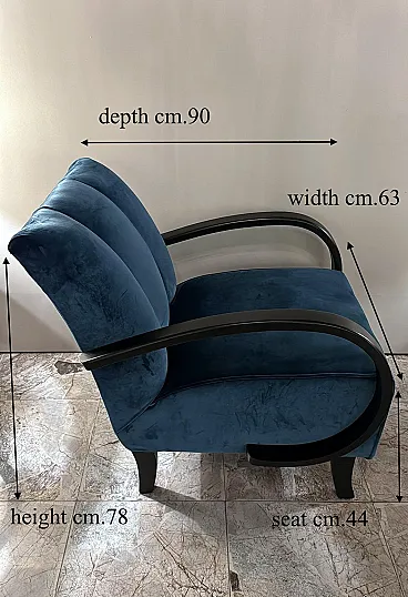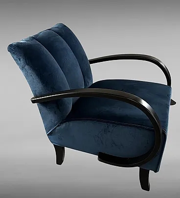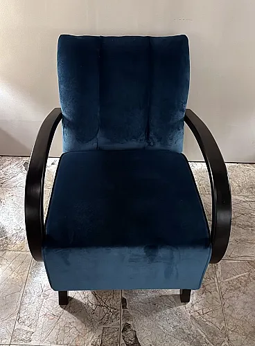 Questa iconica poltrona cecoslovacca, nota come "Sedia Bananna", presenta una struttura solida e robusta realizzata in legno di noce evaporato di alta qualità. Il suo design è semplice e lineare, con braccioli che mostrano un'eccezionale perfezione estetica. L'aspetto complessivo della poltrona è elegante ed emana una rara raffinatezza. Prodotto tra il 1935 e il 1938 a Brno, in Cecoslovacchia, e dopo aver consultato cataloghi e pubblicazioni dell'epoca, possiamo attribuirlo con certezza allo stile di design di Jindřich Halabala. La poltrona è stata sottoposta a un meticoloso e costoso processo di restauro completo. Ciò ha comportato lo smontaggio completo di tutti i componenti, la rifinitura dei braccioli in legno e il rivestimento dell'intero pezzo in velluto blu cinese di alta qualità e resistenza, utilizzando metodi tradizionali e artigianali. Jindřich Halabala nacque il 24 maggio 1903 a Koryčany, in Cecoslovacchia, e morì a Brno nel 1978. Inizialmente formatosi come ebanista nella falegnameria del padre, nel 1920 si iscrisse alla Scuola Statale di Falegnameria di Valašské Meziříčí. In seguito completò i suoi studi pratici presso la United Arts and Crafts Company Manufacture di Brno, diventando infine il capo designer dell'azienda, posizione che mantenne fino al 1946. Halabala influenzò in modo significativo la produzione di mobili a partire dagli anni '30, aprendo la strada alla produzione industriale in Cecoslovacchia. Nel periodo tra le due guerre e nel secondo dopoguerra, creò mobili che adornavano le case di tutta Europa. David Kmínek, responsabile della divisione arredamento, lo descrive così: "Nel lavoro di Halabala c'è una fusione di stili che combina influenze del Funzionalismo e dell'Art Deco. An He ha mescolato questi stili in modo da far risplendere entrambe le tendenze nei suoi mobili. Non si tratta di puro Funzionalismo come in Germania, né di pura Art Deco come in Francia o in Belgio. Inoltre si differenzia dai pezzi più decorativi di Vienna. Halabala ha fuso tutte queste influenze, creando il suo stile di arredamento moderno e distintivo". Il lavoro di Halabala traeva ispirazione dal cubismo ceco, dall'Art Deco e dall'estetica Bauhaus, che cercava di fondere l'arte con la funzionalità quotidiana. Ha sviluppato numerose sedute innovative, due serie fondamentali di mobili modulari e moderni mobili in tubolare d'acciaio. I pezzi disegnati da Halabala nel periodo tra le due guerre e nel dopoguerra sono considerati di altissima qualità. Il loro design semplice e moderno ha reso molte delle sue creazioni popolari e molto ricercate ancora oggi. Le opere di Halabala fanno parte delle collezioni permanenti di istituzioni prestigiose come il Museo d'Arte di Olomouc, la Galleria Moravia di Brno e lo Stedelijk Museum di Amsterdam. Inoltre, la Repubblica Ceca assegna ogni anno un premio a suo nome per celebrare l'eccellenza nell'arredamento e nel design d'interni. Dimensioni: Larghezza: 63 cm- Profondità: 90 cm-Altezza: 78 cm-Altezza del sedile: 44 cm La poltrona, completamente restaurata, è in ottime condizioni.