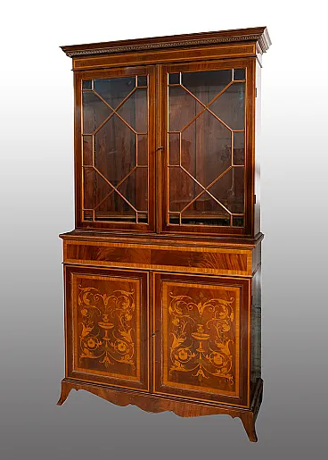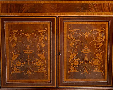 Descrizione: Credenza con alzata antica in piuma di mogano con innesti di intarsio in acero appartenente alla seconda metà del XIX secolo.