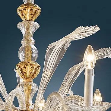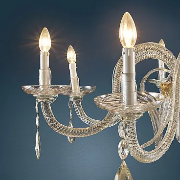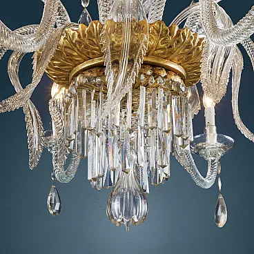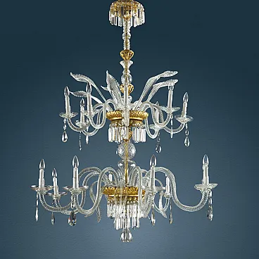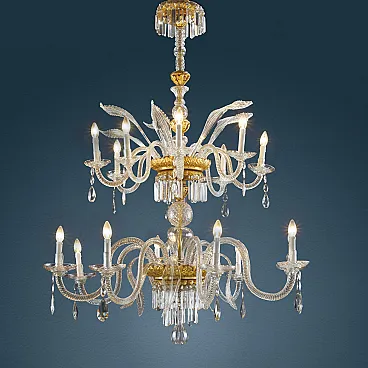 Grande lampadario fiorentino a 16 luci distribuite su doppio ordine, risalente ai primi anni del XIX secolo. Sostenuto centralmente da un'asta in ferro rivestita da vetro soffiato trasparente in diverse lavorazioni e intervallato da elementi in legno intagliato a motivi fogliacei e dorato, due dei quali fungono da alloggi per i bracci in vetro. Decorato con cristalli pendenti a forma di goccia e a forma di prisma, questi ultimi disposti a cascata, mentre un pendente in vetro molato di maggiori dimensioni funge da terminale della sezione inferiore. Foglie in vetro soffiato si alternano ai bracci, completando l'apparato ornamentale. Sostituzioni e piccoli sbecchi. Elettrificato successivamente, nasceva in origine con lumi a candela.