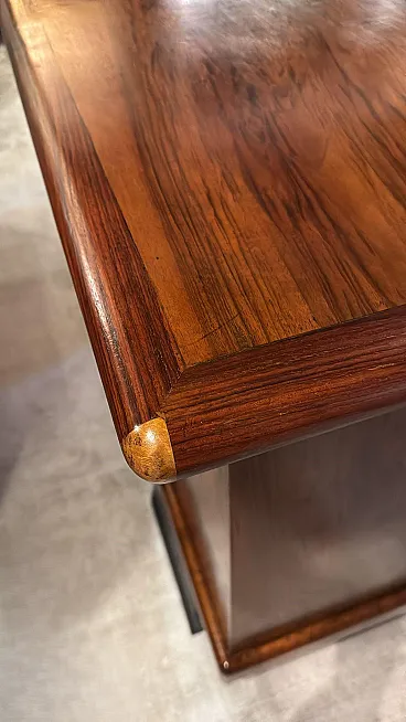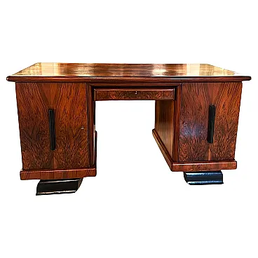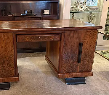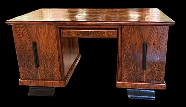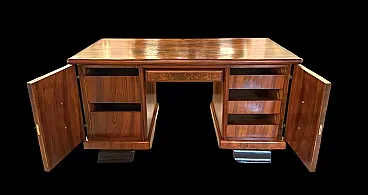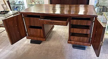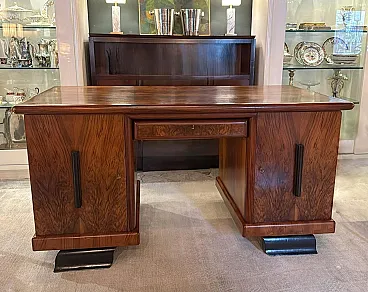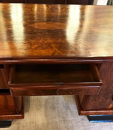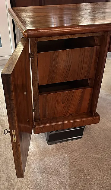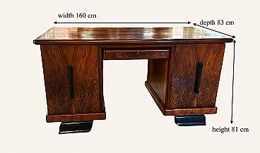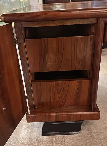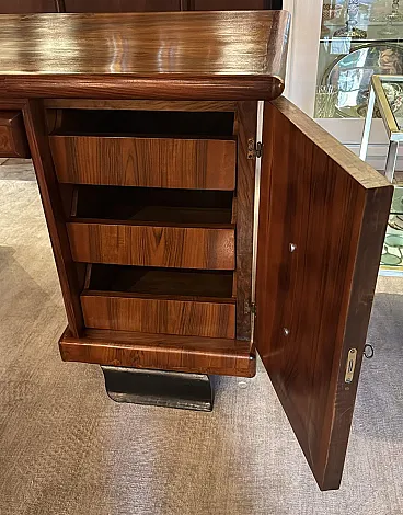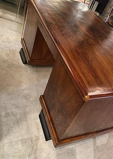 Questa eccezionale e magnifica scrivania italiana di grandi dimensioni è realizzata in noce. Il piano, i pannelli frontali delle ante e il cassetto centrale sono impiallacciati in noce piumato, mentre i cassetti interni, realizzati in noce massiccio, presentano una struttura scatolata per alleggerire il design imponente. Il Wood Wood è uno dei legni più pregiati, caratterizzato da un elegante motivo naturale che ricorda le piume. Questo effetto unico si ottiene tagliando longitudinalmente il tronco dell'albero nel punto in cui si biforca in due rami, rivelando una straordinaria venatura simmetrica. Capolavoro dell'Art Déco, questa scrivania è stata realizzata tra il 1930 e il 1935 in Brianza, tra Como e Monza (Italia), una regione che era - ed è tuttora - rinomata per la sua eccellenza nella produzione di mobili di alta gamma. Negli anni '30, molti arredi italiani di lusso venivano creati nelle rinomate botteghe brianzole, celebri per le loro eccezionali capacità di lavorazione del legno. Questa scrivania è stata probabilmente prodotta da un atelier specializzato nella realizzazione di mobili su misura per una clientela d'élite. Il design riflette lo stile Art Déco internazionale, caratterizzato da linee pulite e armoniose che raggiungono un equilibrio perfetto tra funzionalità e raffinatezza estetica. La scrivania è impreziosita da dettagli distintivi, come le eleganti maniglie verticali in legno nero, che creano un sofisticato contrasto con le calde tonalità del noce. La sua struttura solida e imponente è sostenuta da eleganti piedini neri a slitta, che le conferiscono un senso di leggerezza visiva pur mantenendo una presenza imponente. L'interno è altrettanto curato nei minimi dettagli: il cassetto centrale e gli scomparti laterali con ante rivelano una disposizione pratica e raffinata, con cassetti in noce massiccio magistralmente rifiniti. L'artigianato è di altissima qualità, ispirato all'eleganza dell'Art Deco francese e alla ricca tradizione dell'eccellenza artigianale italiana. Questa scrivania non è un semplice mobile, ma un vero e proprio simbolo di eleganza e prestigio, ideale per collezionisti, interior designer e appassionati di design vintage. Perfetto per chi cerca un pezzo autentico che unisce storia, maestria artigianale e fascino senza tempo. Abbiamo realizzato un elaborato e meticoloso restauro interamente a mano, utilizzando tecniche tradizionali, materiali naturali e metodi praticati nelle botteghe artigiane italiane fin dal XIX secolo. La lucidatura è stata eseguita con un batuffolo di cotone imbevuto di gommalacca e olio di paglia, combinato con polvere di pietra pomice: un'antica tecnica manuale che risale al XVIII secolo. La finitura finale a mano esalta la profondità del legno, arricchendone i toni caldi e le venature intricate. Grazie a questo accurato restauro, la scrivania è in ottime condizioni. Dimensioni: - Lunghezza: 160 cm (63 in) - Profondità: 83 cm (32.7 in) - Altezza: 81 cm (31.9 in)