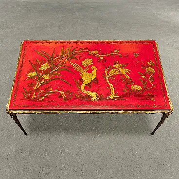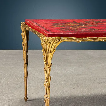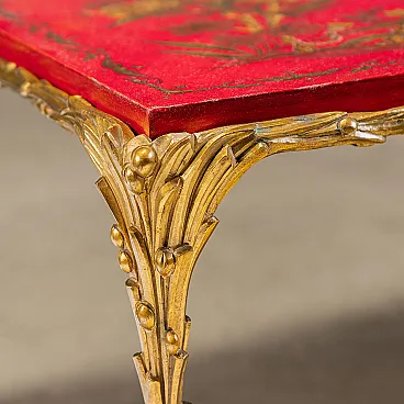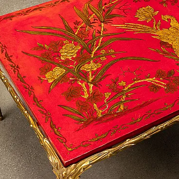 Tavolino in bronzo dorato e lavorato a foglie di alloro e piccole bacche, piano di manifattura cinese in legno laccato rosso dipinto in oro con un volatile al centro della scena, inquadrato tra elementi vegetali.