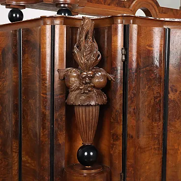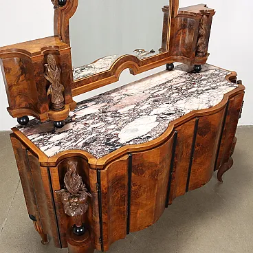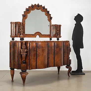 Credenza Art Dèco inizi '900. Realizzata con due ante sul fronte celanti due cassetti e vani a giorno, sul piano in marmo breccia medicea, poggia una monumentale specchiera. Due piedi torniti e intagliati sul retro e due piedi mossi a ricciolo e intagliati sul fronte reggono il mobile, mosso sia nei fianchi che nel fronte con due larghi alloggi nei montanti in cui sono posti due motivi torniti e intagliati con motivi fogliacei e frutti. Specchiera con cimasa a semicerchio intagliata a lambrecchino, al fianco due elementi porta-vaso con al centro due candelabre intagliate come quelle del mobile; la specchiera poggia sul marmo grazie a sei sfere ebanizzate. Tutta la superficie è impiallacciata in radica di noce e alterna intagli in noce a alcuni ebanizzati. Piccole mancanze.