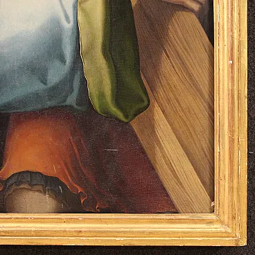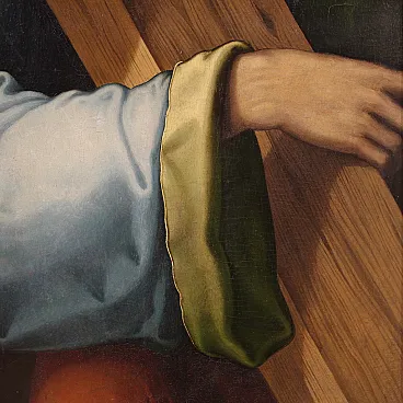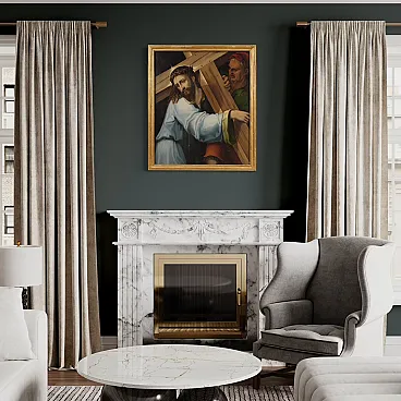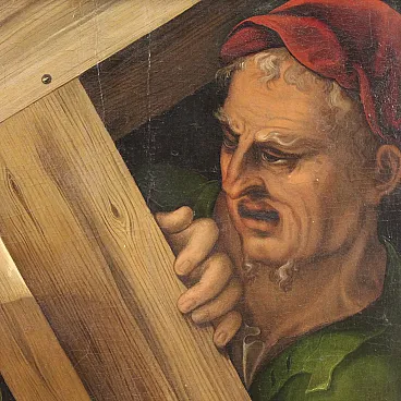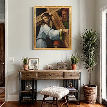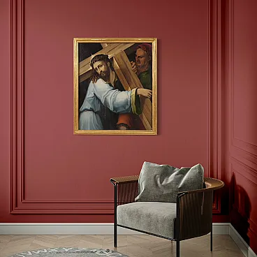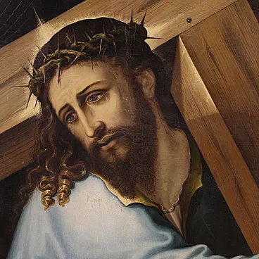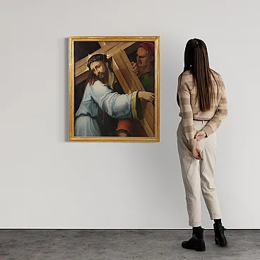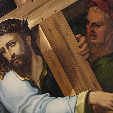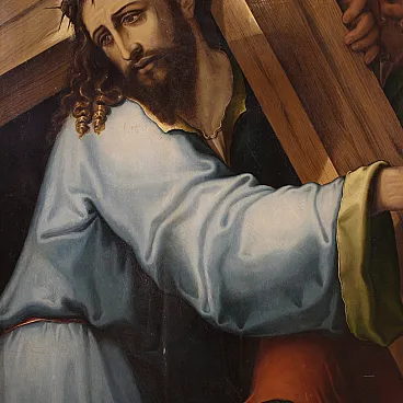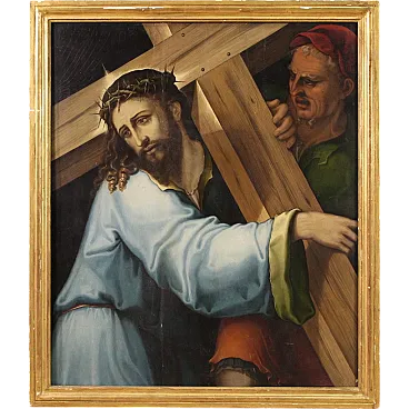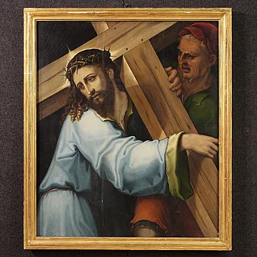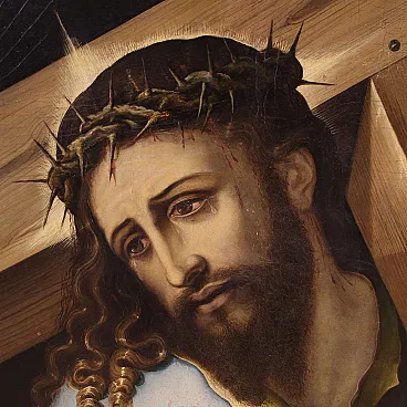Splendido dipinto italiano della prima metà del XVII secolo. Opera ad olio su tavola di notevole qualità pittorica raffigurante Cristo portacroce. Il soggetto trova particolare fortuna nel cinquecento con Tiziano e altri grandi maestri che si cimentano in questa rappresentazione della Via Crucis. In primissimo piano troviamo Gesù che incede verso il monte Calvario portando la croce sulla spalla. L'espressione drammatica del volto solcato dalle lacrime esprime tutta l'umiliazione inflitta dai carnefici e il dolore umano per un destino inevitabile. Da sottolineare il plasticismo scultoreo delle figure e la tecnica esecutiva nella realizzazione delle vesti, dai colori accesi, quasi metallici. Cornice del XX secolo in legno intagliato e dorato, con alcuni segni del tempo. Opera già restaurata con nuova parchettatura sul retro, nel complesso in buono stato conservativo. Luce dipinto H 90 x L 76 cm.