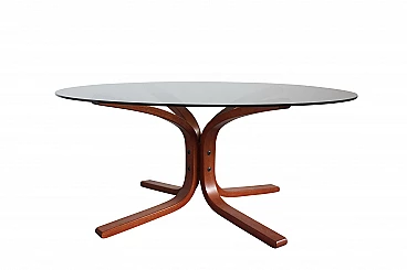Tavolino da salotto con piano in cristallo e supporto in legno, in ottimo stato di conservazione. Produzione italiana, marchio non presente,