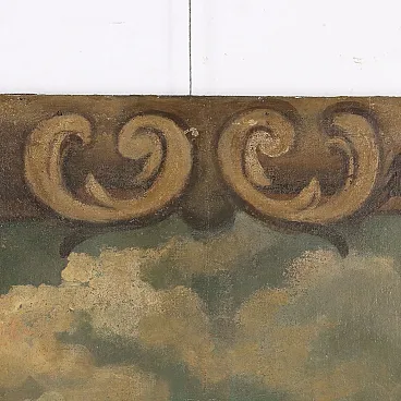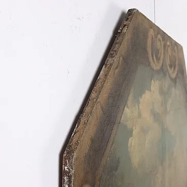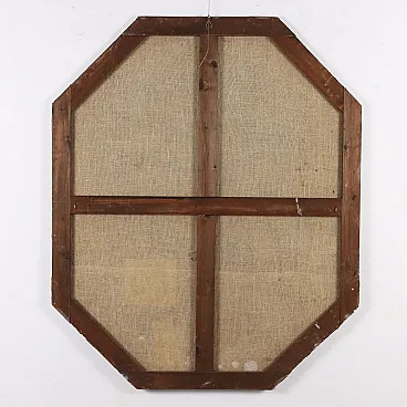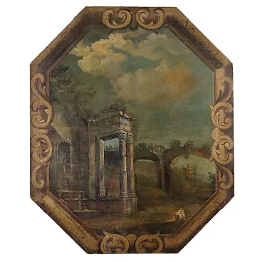 Olio su tela. Di grande formato e sagoma ottagonale, la tela presenta un paesaggio inscritto in una cornice dipinta con fregi, rientrando nella categoria della pittura settecentesca concepita a scopo d'arredo.
