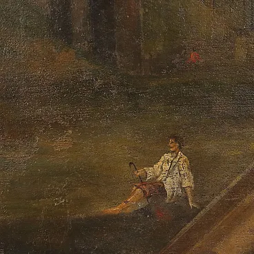 La scena è ambientata presso un fiume, sulla cui riva si innalzano rovine architettoniche di strutture classicheggianti, che svettano maestose sulle figurine di personaggi popolari animanti la scena.