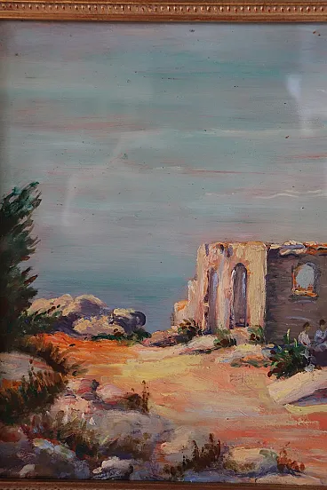 Questo squisito dipinto a olio su compensato di scuola italiana, risalente alla prima metà del XX secolo, presenta un paesaggio accattivante che incarna il fascino dell'Italia meridionale. Il dipinto reca una firma in basso a destra, ma l'autore non è stato identificato e il dipinto non è autenticato.