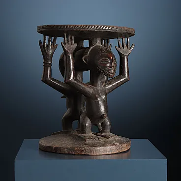 Terzo Quarto del XX secolo Descrizione: Vero capolavoro scultoreo, questo seggio di capo esprime al massimo livello la grande maestria raggiunta nel corso dei secoli dagli scultori dell’etnia luba del Congo orientale. I due antenati, le cui immagini sono quasi speculari ma differenziate sessualmente, sostengono il sedile circolare sulle punta delle dita con un gesto aggraziato. I volti sono ieratici e assorti, con occhi socchiusi nelle ampie orbite e un vago sorriso che trasmette una composta serenità. L’acconciatura dei capelli si protende all’indietro, i corpi dalle superfici levigate recano le scarificazioni che identificano l’etnia. Pregevole patina d’uso. Nel suo insieme la scultura comunica un grande senso di equilibrio e armonia. Dimensioni:57 x 42 x 33 cm