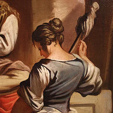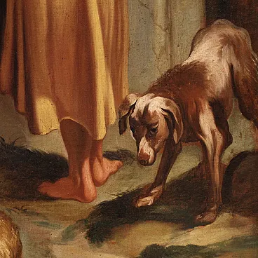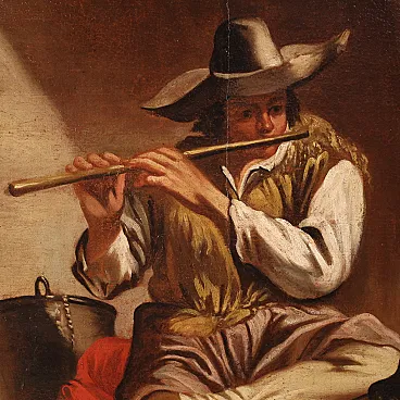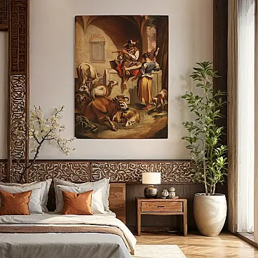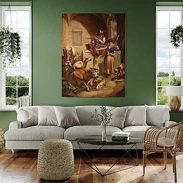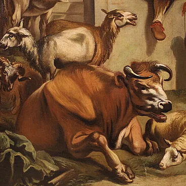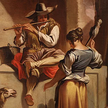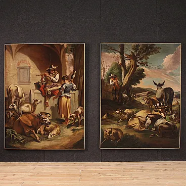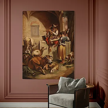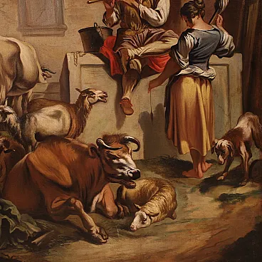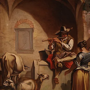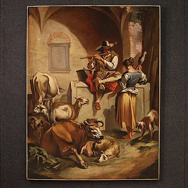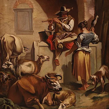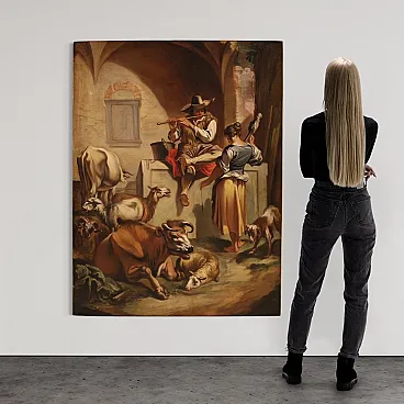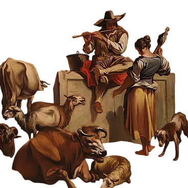 Grande quadro italiano della metà del XVIII secolo. Dipinto ad olio su tela raffigurante splendida scena di genere pastorale attribuibile al pittore milanese Francesco Londino (l’opera al momento non è accompagnata da expertise, ma è possibile ottenerla previo pagamento dei relativi costi aggiuntivi). Era famoso per le sue scene agresti animate da greggi, bovini e figure contadine immerse in un’atmosfera idilliaca. In primo piano infatti la composizione è dominata da una ricca varietà di animali da fattoria, tra cui mucche, capre e pecore, disposti con sapiente equilibrio. In secondo piano invece vediamo un pastore che suona il flauto, mentre una giovane donna intenta a filare lo ascolta con interesse. Quadro già restaurato con rintelo, sostituzione del telaio e ripresa del colore in piccoli punti. Nel complesso in buono stato conservativo. Opera facente parte di una coppia, vedi foto e richiedi il prezzo in blocco se ancora disponibile.