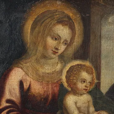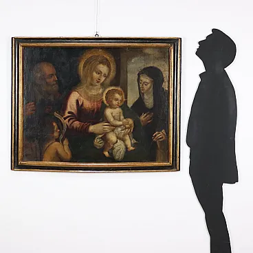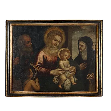 Le figure, ritratte in primo piano a mezzo busto, vedono collocata al centro Maria con in braccio il Bambin Gesù; alle loro spalle sulla sinistra San Giuseppe e sotto di lui il piccolo Giovanni Battista, vestito di pelli e con il tradizionale bastone a croce con la fascia recante la scritta \"Ecce Agnus Dei\".