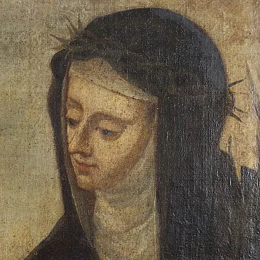 Gli sguardi di queste quattro figure sono rivolti a sinistra, ove compare Santa Caterina da Siena, riconoscibile dall\'abito nero delle domenicane, e da suoi attributi iconografici, la corona di spine, le stigmate e il giglio.