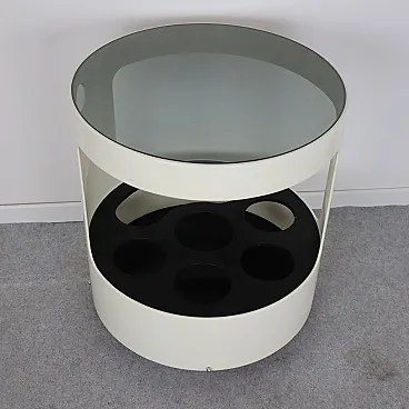 Questo sofisticato carrello bar italiano degli anni '70 è un bell'esempio di design Space Age, ispirato alle creazioni visionarie di Joe Colombo. La struttura cilindrica è realizzata in metallo laccato bianco e presenta un piano in vetro fumé, che aggiunge un'estetica elegante e leggera.