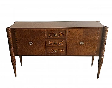 Credenza anni 50 disegnata da Pier Luigi Colli ( 1895-1968 ) per la ditta Fratelli Marelli. Presenta due ante laterali, una delle quali cela due cassetti, e tre cassetti centrali intagliati con figure di animali. Gambe troncoconiche intagliate. Maniglie e puntali in ottone. Epoca anni 50. Condizioni ottime.