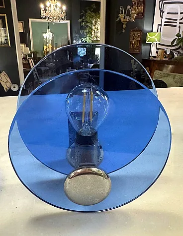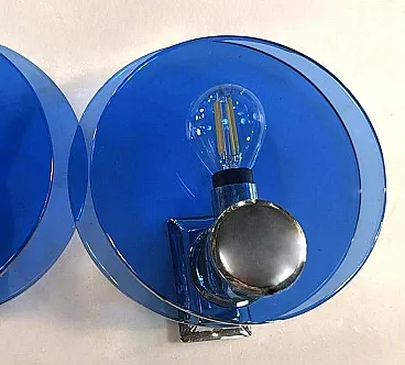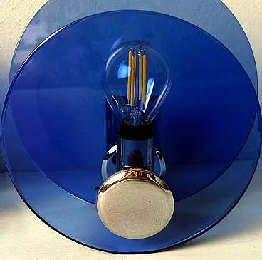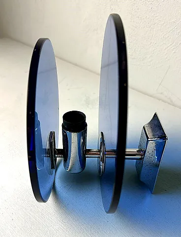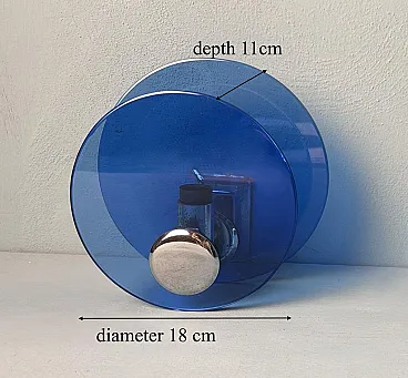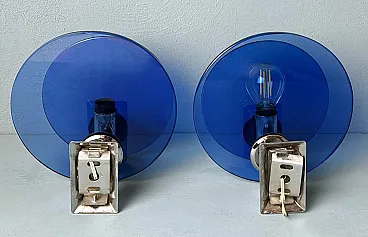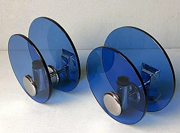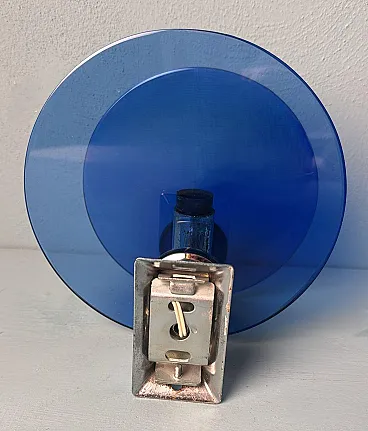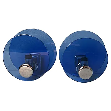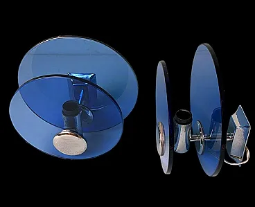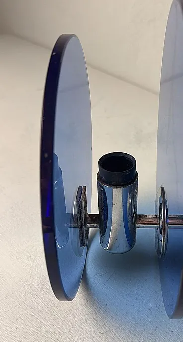 Questa elegante e sofisticata coppia di applique vintage italiane è realizzata in ottone nichelato lucido. Ogni applique presenta due pannelli circolari di squisito vetro blu, sapientemente lavorati per diffondere una luce soffusa e ambientale. I pannelli di vetro sono tenuti in parallelo da una struttura centrale in ottone nichelato, che ospita la presa della luce. Sul retro, una robusta piastra di montaggio in metallo consente un'installazione a parete sicura, con il cablaggio elettrico che parte dalla parte posteriore. Queste applique sono state prodotte tra il 1960 e il 1965 in un laboratorio artigianale alla periferia di Milano (Lombardia, Italia), dove abili artigiani hanno seguito fedelmente un design ispirato alla rinomata azienda Veca, ispirandosi a un concetto di Fontana Arte. Veca è un prestigioso marchio italiano che da decenni trasforma il vetro e la plastica in elementi di design funzionali. Fontana Arte, fondata a Milano nel 1932 da Luigi Fontana e Giò Ponti, è un'altra stimata azienda italiana specializzata nella lavorazione del vetro e nell'illuminazione decorativa di alto livello. Queste applique incarnano lo stile distintivo e la maestria del design italiano degli anni '60 e '70, un'epoca in cui l'Italia era leader nelle soluzioni di illuminazione innovative. La combinazione di vetro colorato e metallo era un segno distintivo di questo periodo, che si traduceva in pezzi sorprendenti e senza tempo. Le loro dimensioni ben proporzionate li rendono una scelta ideale per arricchire qualsiasi interno con un tocco di eleganza. L'interazione tra il vetro blu intenso e il metallo riflettente crea un accattivante contrasto visivo, rendendo queste applique non solo fonti di luce, ma vere e proprie affermazioni decorative. Queste applique si integrano perfettamente in interni sia moderni che classici. Sono perfetti per aggiungere un tocco raffinato a un soggiorno, un corridoio sofisticato o una camera da letto elegante, dove creano un'atmosfera calda e invitante. La loro estetica senza tempo permette di completare l'arredamento contemporaneo o di portare un elemento di design elegante in ambienti più tradizionali. La luce morbida e diffusa attraverso il vetro blu crea un ambiente rilassante e intimo, ideale per mettere in risalto i dettagli architettonici o gli elementi decorativi di uno spazio. In un ambiente vintage o moderno di metà secolo, queste applique sono il tocco finale perfetto, grazie al loro caratteristico design degli anni '60-'70. Inoltre, sono ideali per spazi commerciali come ristoranti, boutique o gallerie d'arte, dove l'illuminazione deve essere funzionale ed esteticamente accattivante. Le applique sono in buone condizioni d'epoca, con lievi segni di ossidazione sulle prese e sulla struttura nichelata, coerenti con la loro età. L'impianto elettrico è originale e funzionante, ma presenta cablaggi europei e deve essere ispezionato o sostituito se necessario. Abbiamo incluso solo una lampadina in modo che gli acquirenti possano scegliere la forma e lo stile più adatti alle loro preferenze. Dimensioni: Diametro: 18 cm (7,1"). Profondità: 11 cm (4,3").