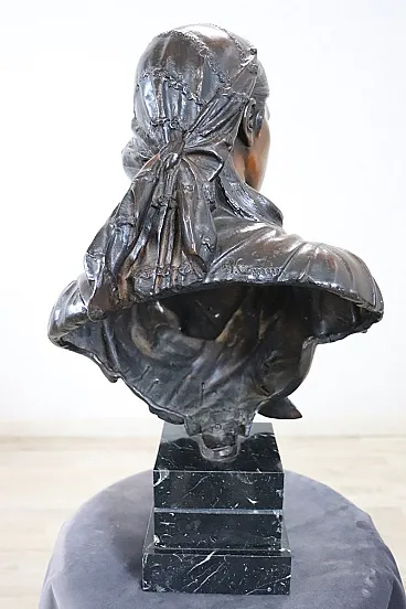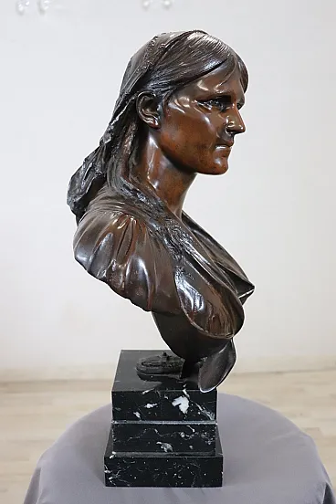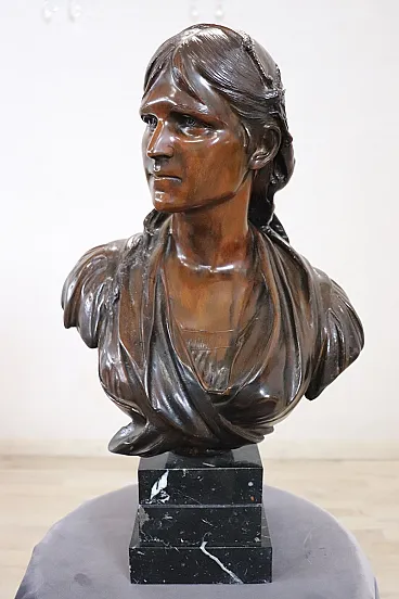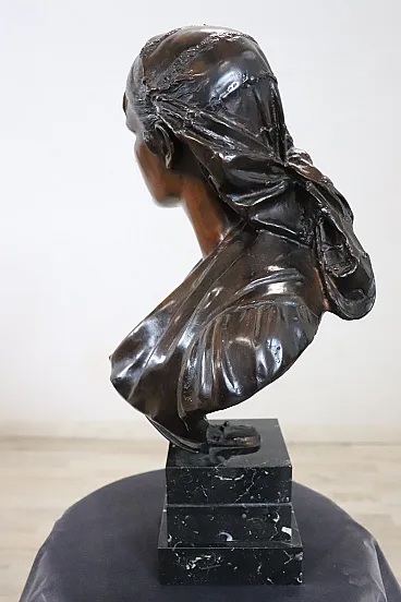 Il busto non solo è straordinario per la sua fattura, ma aumenta anche il suo fascino visivo con una sofisticata base in marmo nero. Questa base crea un bellissimo contrasto con i toni caldi del bronzo brunito, aggiungendo profondità ed eleganza alla presentazione complessiva.
