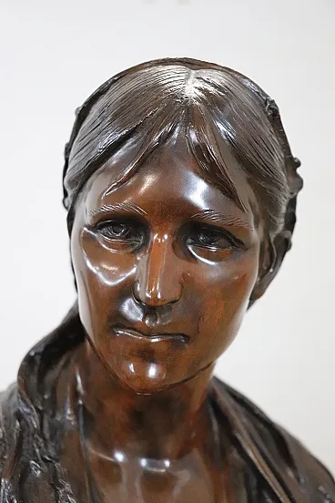 La scultura cattura l'essenza di una giovane donna vestita in modo semplice, con i capelli elegantemente legati in un foulard, evocando un senso di umili origini, forse contadine. Tuttavia, il suo volto emana un carattere forte, completato da un'espressione serena e da un sorriso sottile. Questo suggerisce che l'artista ha cercato di elevare le figure quotidiane della società, celebrando la loro bellezza e dignità attraverso l'arte.