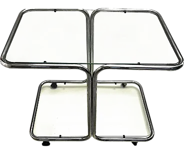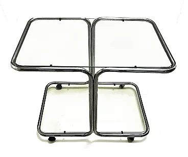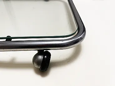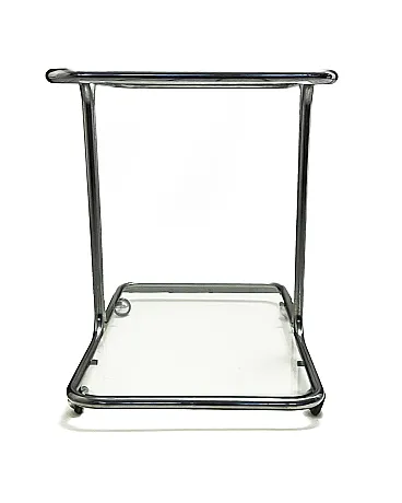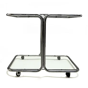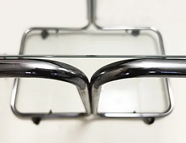 Elegante e raro carrello bar o da portata, realizzato in Italia negli anni ’70, con un design raffinato che richiama lo stile di Milo Baughman e del Design Institute America. La struttura in tubolare di cromo dalla linea continua sostiene due ampi ripiani in vetro, creando un effetto visivamente leggero e moderno.