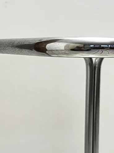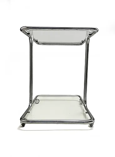 Un perfetto esempio di manifattura italiana di alta qualità: la cromatura, ancora brillante dopo oltre 50 anni, ne testimonia la resistenza e l’eccellente realizzazione. Il carrello si muove agevolmente su rotelle nere in ABS, garantendo praticità oltre a un’estetica sofisticata.