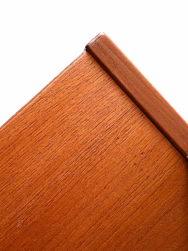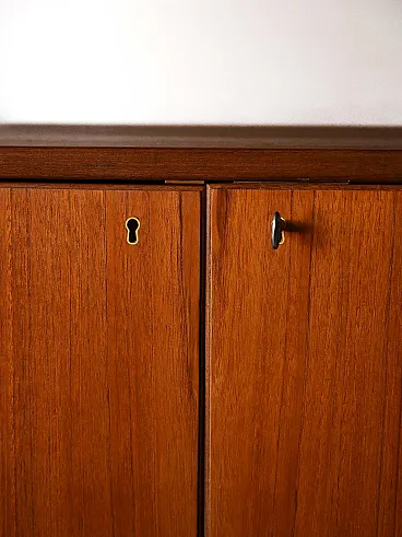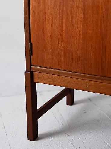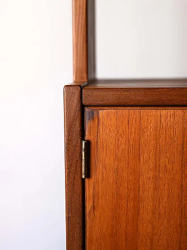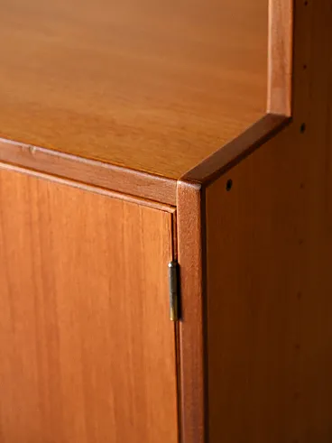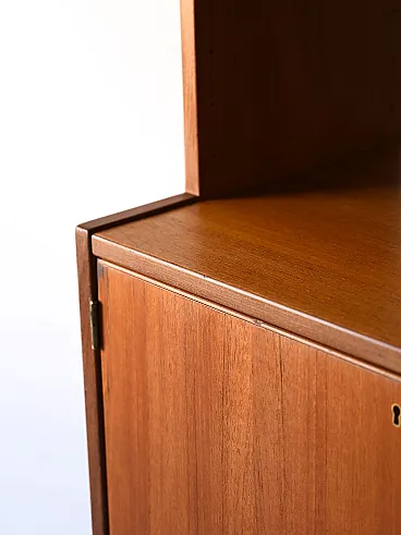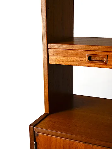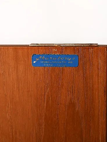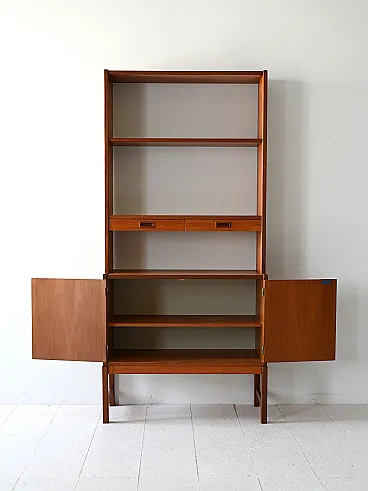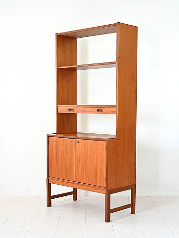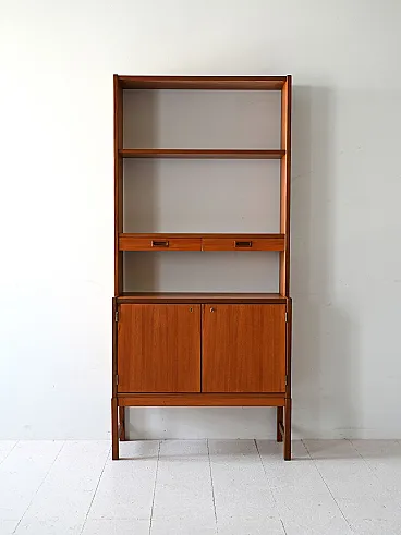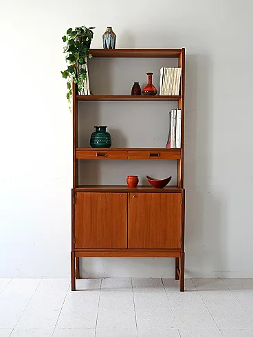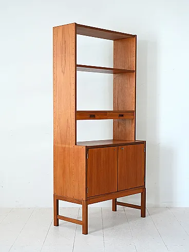 Libreria vintage anni '50 di Skaraborgs in teak, con due mensole, cassetti centrali e vano chiuso con mensola interna.