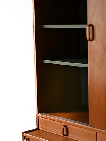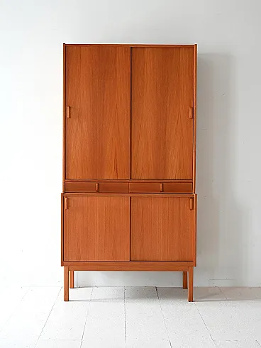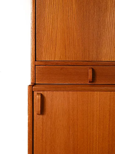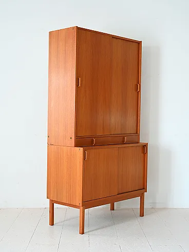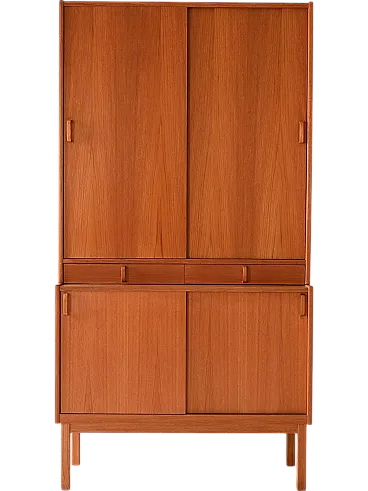 Armadio in teak con vani contenitore, mensole interne e ante scorrevoli sia nella parte superiore che inferiore. Prodotto da Bodafors.