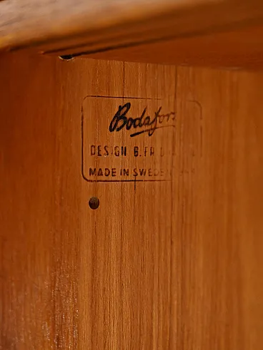 Questo armadio è un design di Bertil Fridhagen per Bodafors, realizzato probabilmente negli anni '50 o '60. La struttura è suddivisa in due sezioni con ante scorrevoli sopra e sotto, mentre al centro si trovano due cassetti. L'interno è attrezzato con mensole, alcune rifinite in verde. Le linee pulite, le maniglie integrate e la lavorazione in teak riflettono l’eleganza funzionale del design scandinavo dell’epoca. Buone condizioni. Potrebbe presentare dei segni del tempo. Per piacere presta attenzione alle fotografie.