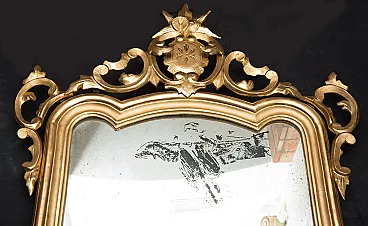 La specchiera si presenta come un trionfo di legno intagliato con un movimento che si sviluppa dal basso verso l'alto dove è possibile apprezzare tutta la sua finezza.