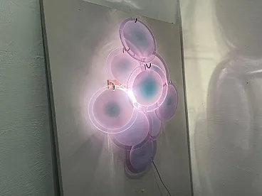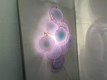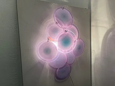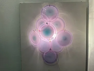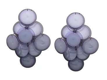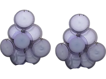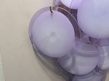 Additional Item Information - Blue Lavender Murano Disc Sconces 1970’s This peculiar technique is produced with the inclusion of neodymium oxide into the molten glass. In this way, the Murano glass artwork will change color with different lighting conditions: lavender appears with natural, yellowish or warm white artificial light. Blue under fluorescent or cold white light. Each sconce is composed of 9 discs each disc varies in size as all are mouth blown Height 50 cm Width 39 cm Depth 15 cm New wiring installed compatible with EU UK USA brass frames