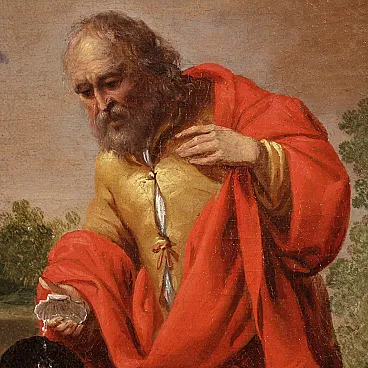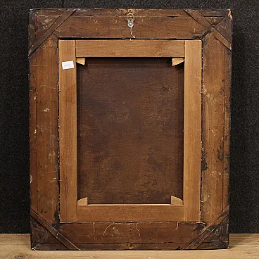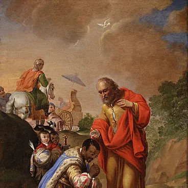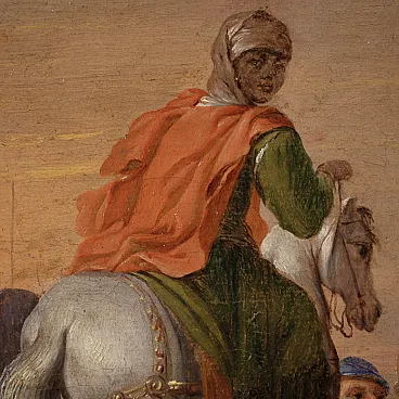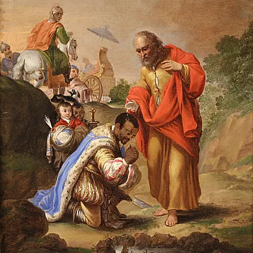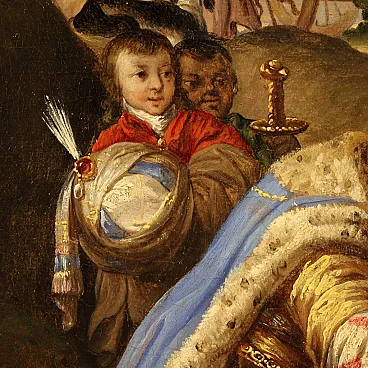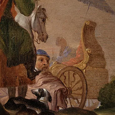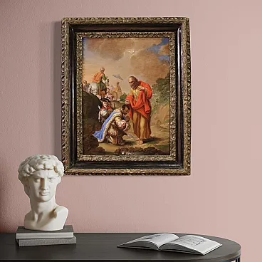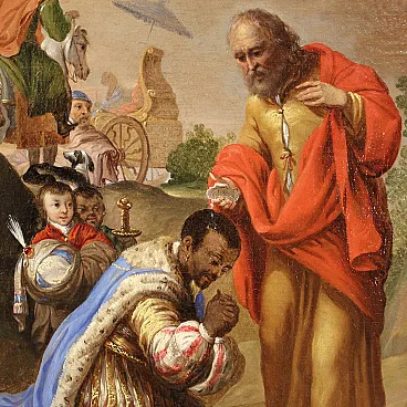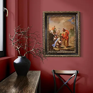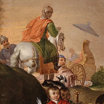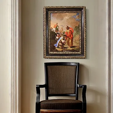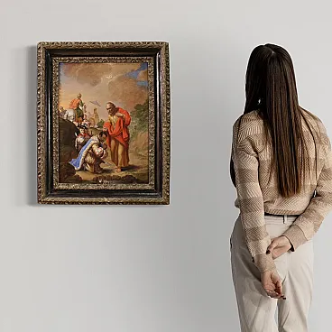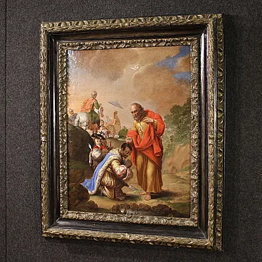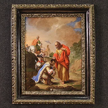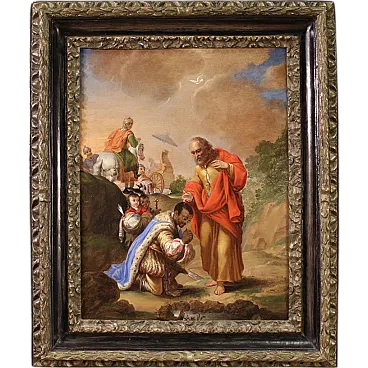 Splendido quadro fiammingo della seconda metà del XVII secolo. Opera ad olio su tela raffigurante una rara scena biblica, il battesimo dell'eunuco etiope da parte di San Filippo. Un alto dignitario della regina d'Etiopia incontra il Santo lungo la strada per Gerusalemme e i due si confrontano sui temi della fede. Alla fine si fermano presso un piccolo fiume e l'eunuco viene battezzato, il primo battesimo di un gentile (non ebreo) raccontato nel nuovo testamento. La composizione è strutturata in modo da guidare lo sguardo dal primo piano al fondo, dove si intravede il corteo regale con cavalli e servitori. La tavolozza è calda con un forte contrasto tra il rosso acceso del mantello di San Filippo e gli ori e azzurri della preziosa veste dell'eunuco. Poco dietro due paggi reggono la spada e il meraviglioso turbante mentre una colomba che scende dal cielo rappresenta l'approvazione divina. Cornice del XIX secolo in legno riccamente intagliato e laccato, con alcuni segni del tempo. Opera già restaurata con rintelo, sostituzione del telaio e ripresa del colore in piccoli punti. Nel complesso in buono stato conservativo. Luce dipinto H 53 x L 40 cm.