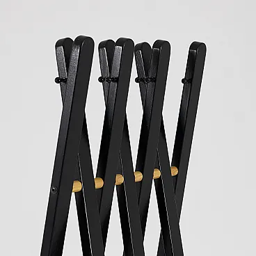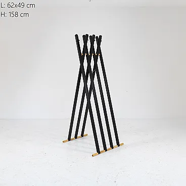 Questo elegante attaccapanni anni '70 è un perfetto esempio di design funzionale e raffinato. Realizzato in legno laccato nero con dettagli in frassino, presenta una struttura geometrica che lo rende un pezzo d’arredo originale e di grande impatto visivo. La sua particolarità sta nella chiusura, che permette di riporlo facilmente quando non in uso, rendendolo ideale per chi cerca una soluzione pratica senza rinunciare allo stile. Con le sue dimensioni di 62x49 cm alla base e un’altezza di 158 cm, è perfetto per l’ingresso, la camera da letto o qualsiasi ambiente in cui si desideri un tocco di design vintage.