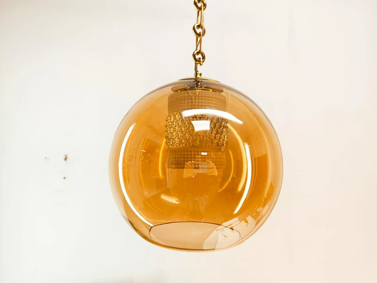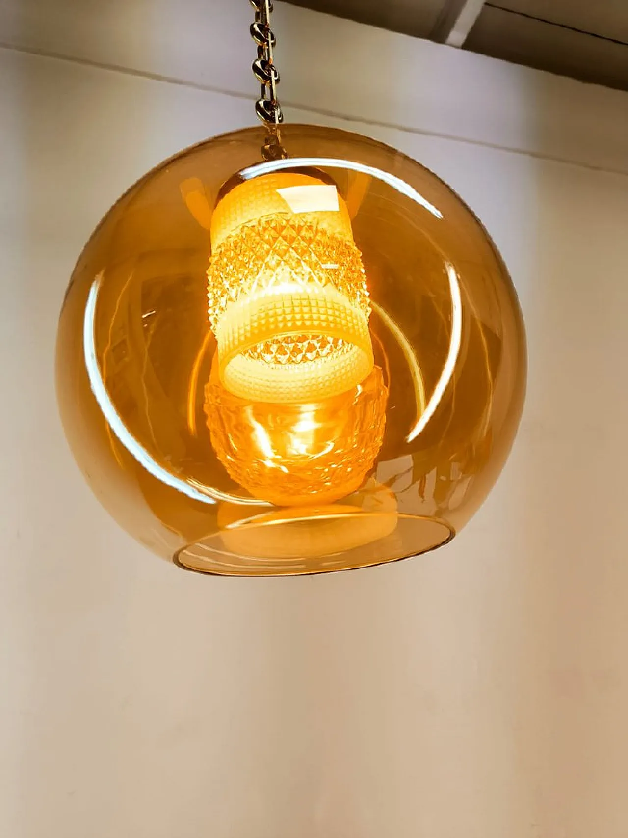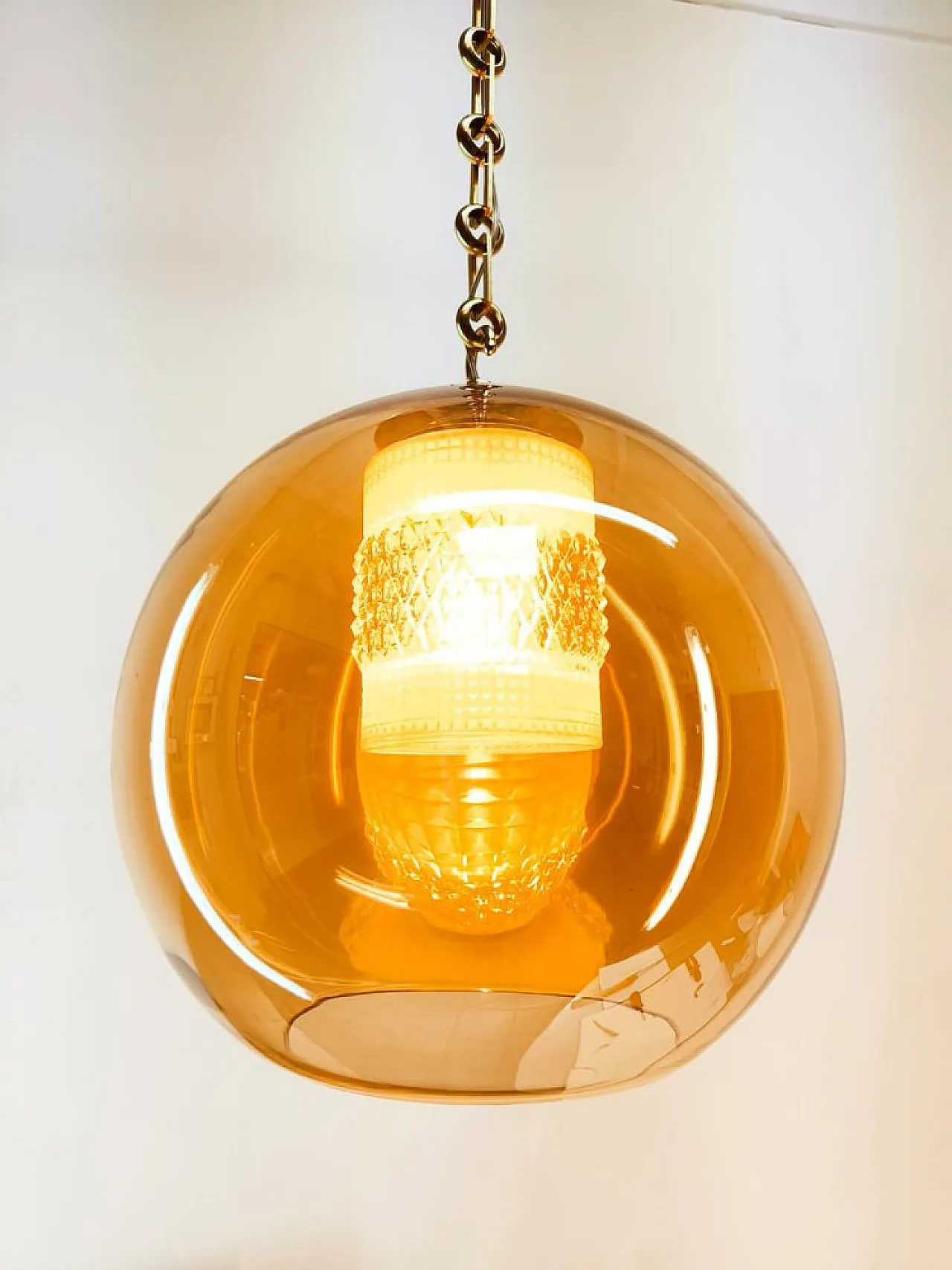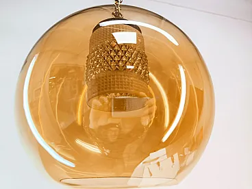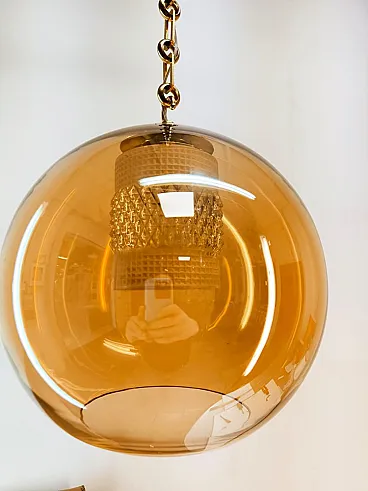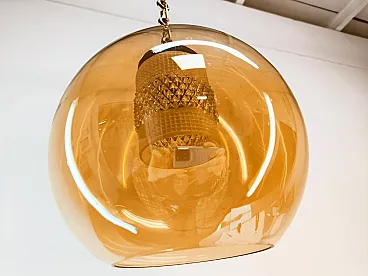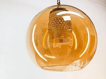 Sospensione in doppio vetro ambrato con struttura in ottone, anni '70