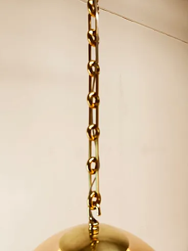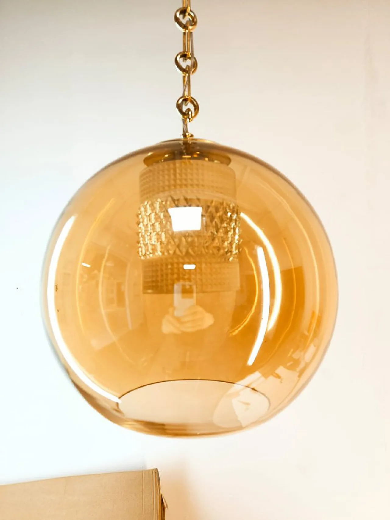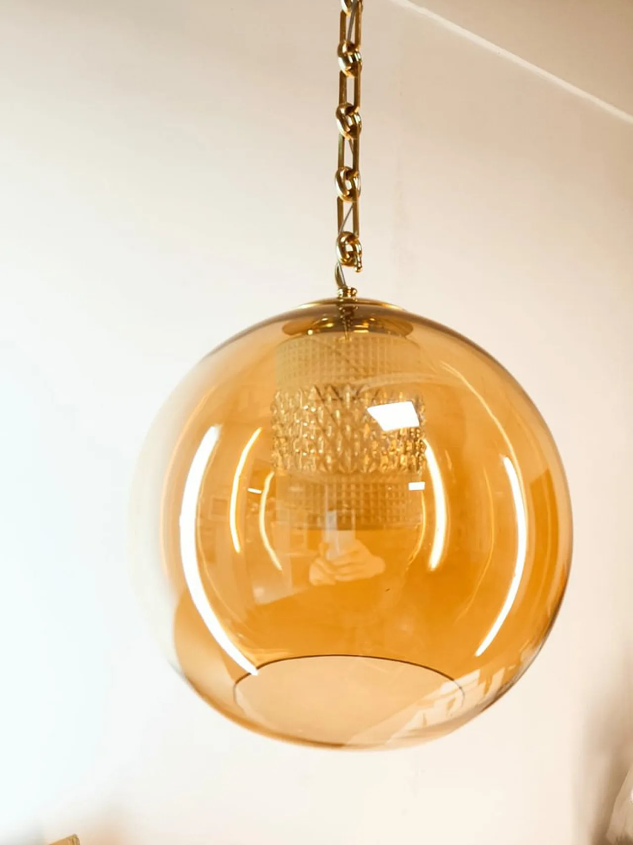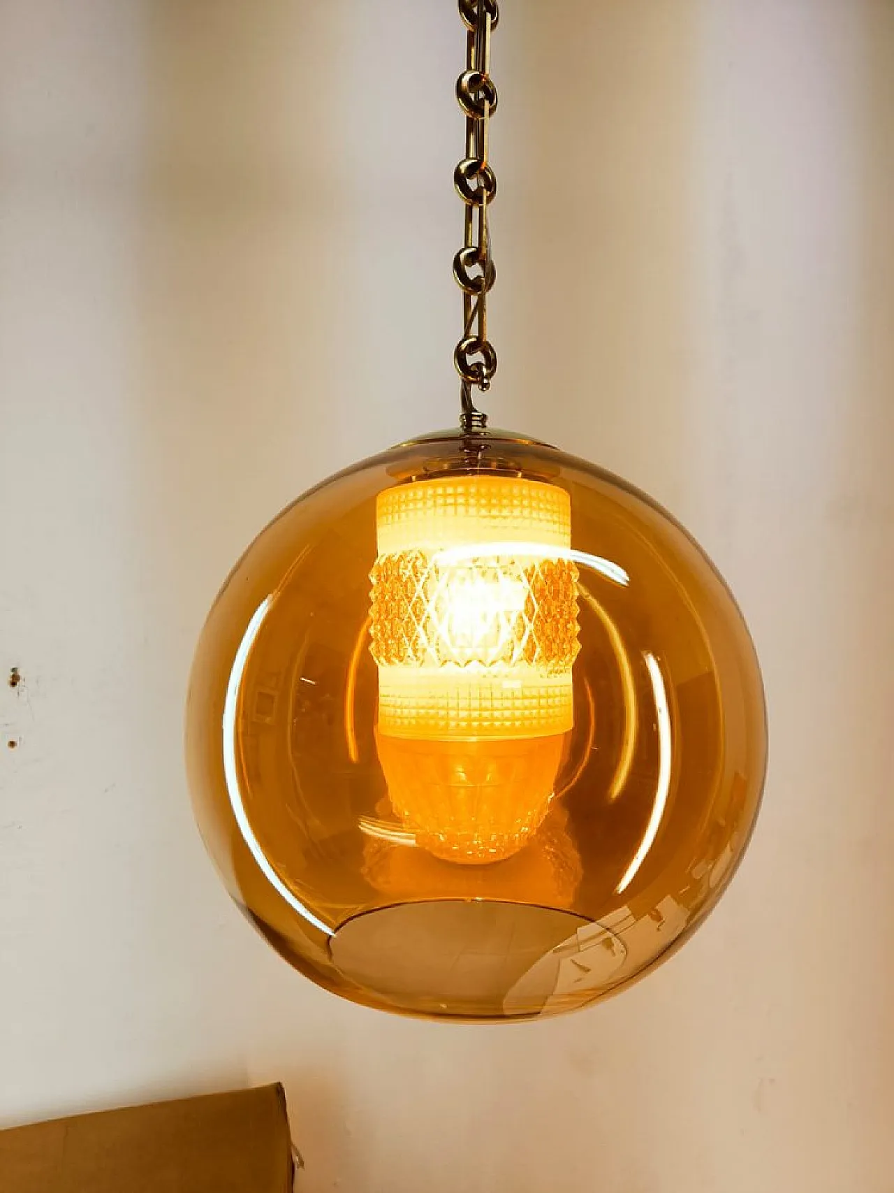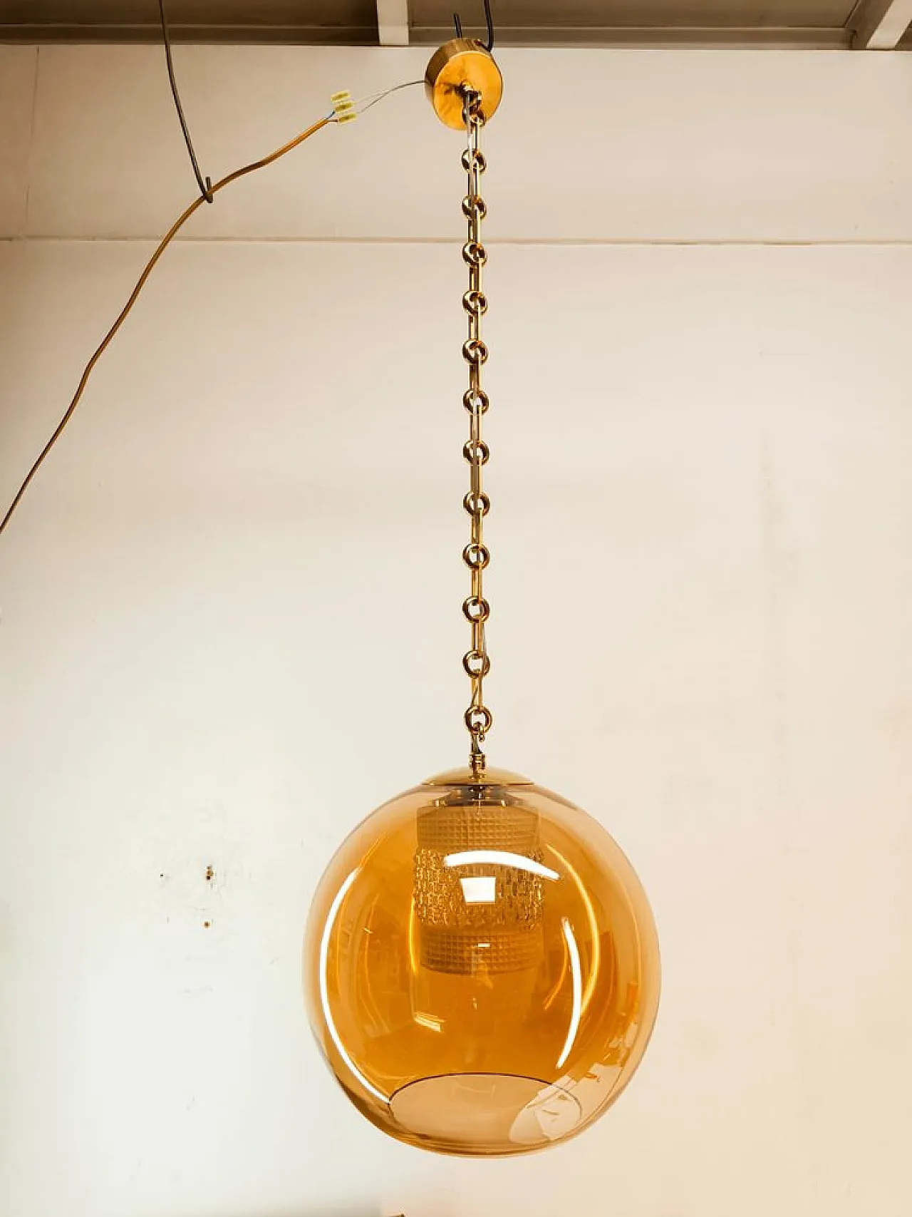Sospensione in doppio vetro ambrato con struttura in ottone, anni '70