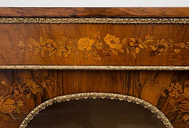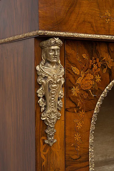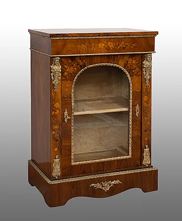Descrizione: Vetrina Vittoriana in radica di noce con innesti di intarsio a motivo floreale interamente realizzato con legni esotici pregiati.