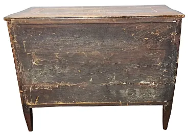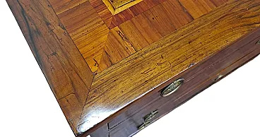 L' intera superficie presenta filetti e cornici realizzate con differenti essenze lignee ed il fronte ed il piano sono centrati da rosone a foglie d' acanto.