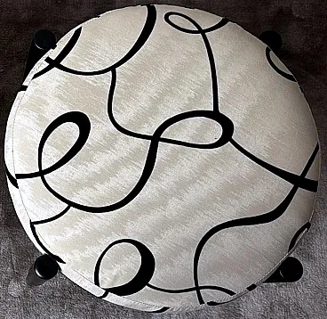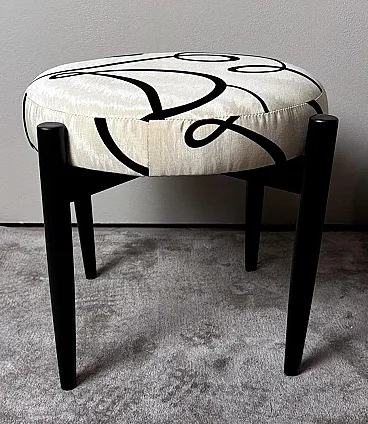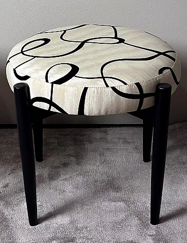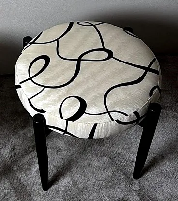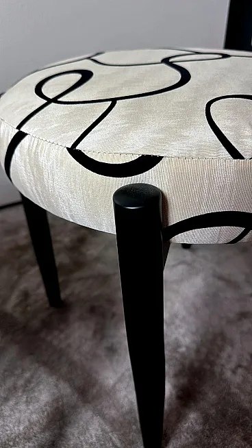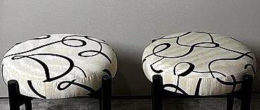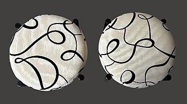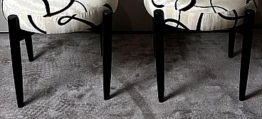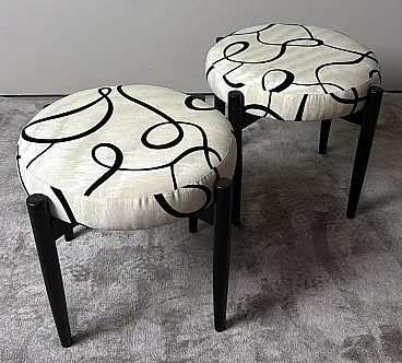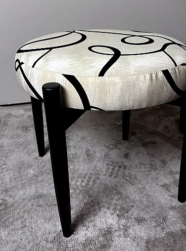 Questa elegante e sofisticata coppia di sgabelli italiani presenta una seduta rotonda e una robusta struttura in legno massiccio ebanizzato. Le gambe, che hanno una sezione rotonda affusolata, sono collegate sotto la seduta da due traverse che si intersecano, sostenendo la base imbottita. Questi sgabelli sono stati realizzati tra il 1958 e il 1960 in uno dei tanti laboratori artigianali di Lissone (Monza-Brianza, Italia), una città rinomata per la lavorazione del legno di alta qualità. Gli artigiani hanno cercato di creare sedute compatte ma comode e intime, conferendo agli sgabelli un'originalità senza tempo e seguendo le tendenze del design dell'epoca. Il contrasto tra la rigidità della struttura in legno e il morbido calore della seduta imbottita ne esalta il fascino unico. Abbiamo restaurato con cura i sedili sostituendo il pad e la tappezzeria. Il maestro artigiano che ha eseguito il lavoro ha scelto un tessuto raffinato e di alta gamma: un velluto bianco floccato Moiré con un innovativo motivo nero, prodotto dalla prestigiosa azienda tessile Dedar. Dedar è una storica azienda tessile con sede in Lombardia, nota per l'eccellenza artigianale e l'esperienza nella creazione di tessuti esclusivi e originali. L'azienda esprime uno stile distintivo, spingendosi continuamente oltre i confini dell'interior design di lusso. Specializzata in tessuti e carte da parati di alta gamma, Dedar è rinomata per l'estetica raffinata, la meticolosa attenzione ai dettagli e l'uso di materiali pregiati. La loro vasta collezione comprende tessuti per tappezzeria, tendaggi, velette, passamanerie e un'esclusiva selezione di carte da parati. Il design e lo stile italiano dell'azienda sono riconosciuti a livello internazionale. Nelle foto, eventuali irregolarità o scolorimenti percepiti sul tessuto bianco non sono difetti, ma piuttosto gli splendidi e affascinanti riflessi caratteristici della finitura Fabrice. Grazie alle loro caratteristiche uniche, questi sgabelli donano eleganza e charme a qualsiasi spazio, fondendo perfettamente stile e comfort. Utilizzate in coppia o singolarmente, offrono una soluzione di seduta elegante e funzionale. Perfetti per qualsiasi ambiente, possono valorizzare un ingresso, completare una camera da letto ai piedi del letto, aggiungere raffinatezza a un soggiorno o servire come accento raffinato in un ufficio. Il loro pad morbido e confortevole ti invita a sederti e a goderti momenti di puro relax. Essendo stati restaurati professionalmente, gli sgabelli sono in condizioni eccellenti. Dimensioni: - Diametro: 41 cm (16.1 in) - Altezza: 38 cm (15 in) - Seduta: 38 cm (15 in)