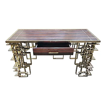 Consolle bifacciale in acciaio cromo-oro e top in radica