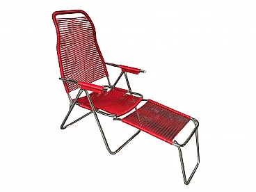 Rara SEDIA / LETTINO a SDRAIO degli anni’60 in corda vuota di plastica ROSSA che si intreccia su una struttura di metallo cromato con i tappini dei braccioli di plastica bianchi. Con la prolunga che da sedia la fa diventare lettino ricorda una chease-long. È richiudibile ed ha ancora l’etichetta del negozio che l’aveva venduta(il numero telefonico ancora senza prefisso). Lo stato di conservazione è pari al nuovo perché mai usata(era ancora imballata) e questo la rende da collezione. Reclinabile in 6 posizioni arriva fino a 176cm. di lunghezza.