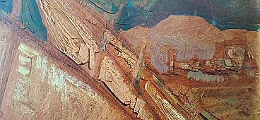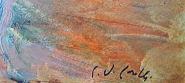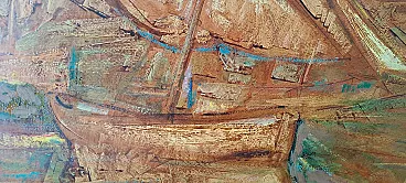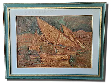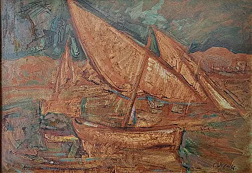 Dipnto ad olio su cartoncino raffigurante barche a vela. L' opera è collocabile nell' ambito espressionista del maestro ed è databile agli anni ' 50. Firmato in basso a destra. Le dimensioni sono: 91 x 71 compresa la cornice, 70 x 50 il dipinto. Giuseppe Guglielmo Umberto Caselli, detto Pino (Luzzara, 5 luglio 1893 – La Spezia, 19 dicembre 1976), è stato un pittore italiano. Nato nel 1893 nella località Villarotta di Luzzara (Reggio Emilia), si forma alla Scuola libera del nudo all'Accademia di Firenze. Tornato alla Spezia, dove risiede fin da bambino, è allievo di Del Santo e di Discovolo. Entra in contatto con l'ambiente artistico che gravita intorno alla nuova rivista L'Eroica dello scrittore spezzino Ettore Cozzani e si dedica all'incisione xilografica. Nel 1913 conosce Lorenzo Viani. Durante la prima guerra mondiale è fatto prigioniero e internato nel campo di prigionia di Mauthausen in Austria; da questa esperienza ha tratto numerose opere premonitrici del dramma del successivo conflitto. La sua pittura improntata dapprima alle prime esperienze divisioniste di inizio XX secolo giunge ad un personale espressionismo, vicino ai movimenti innovatori austriaci, ma anche alla poetica di Viani. Molti suoi lavori sono ispirati ai ricordi della prigionia. Con lavori di aeropittura, nel 1933 espone al Premio del Golfo organizzato da Filippo Tommaso Marinetti e tornerà a parteciparvi in molte delle edizioni successive. Molto legato alla Spezia, dipinge i tanti aspetti della città e della sua provincia, della Lunigiana e delle vicine Cinque Terre in particolare. Il Centro Allende della Spezia nel 1981 gli ha dedicato una mostra antologica postuma.