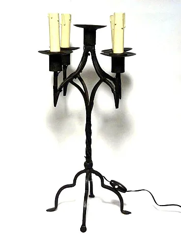 Lampada da tavolo in ferro battuto con portacandela, primo '900