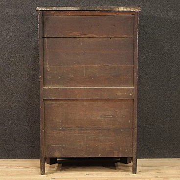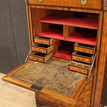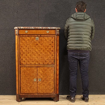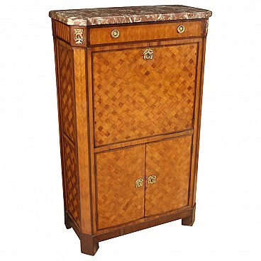 Antico secrétaire francese à damiers della prima metà del XIX secolo. Mobile di bella linea e grande eleganza lastronato in legni di noce, palissandro, acero e legno esotico adornato da intarsio geometrico. Mobile arricchito da favoloso marmo originale dal peso considerevole e dallo spessore di 3 cm (vedi foto). Secrétaire da salone o studio, per antiquari e arredatori, munito di un cassetto, piano a calatoia e due ante inferiori (vedi foto). Ante inferiori leggermente bombate dal tempo (da pressare). Interno della credenza completo di un piano di appoggio e piano a basamento. Interno della calatoia munito di 6 cassettini, 5 vani porta documenti e piano scrittoio rivestito in cuoio con diversi segni di usura e strappi (da sostituire. Meccanismo di scorrimento della calatoia da restaurare (vedi foto) ora sorretto da catenelle (vedi foto). Mobile completo di una chiave funzionante per entrambe le serrature. Secrétaire in bella patina con diversi segni del tempo. Da restaurare.