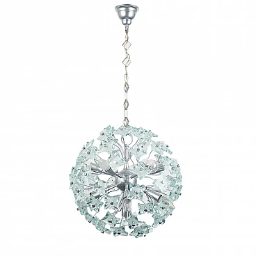Lampadario Sputnik a sospensione con 13 luci prodotto in Italia intorno agli anni '70. Struttura in acciaio cromato con petali in vetro. Funzionante. Da segnalare lievi sbeccature sul vetro, come da foto. Sicuramente la parte in metallo è stata riverniciata. Manca un petalo.