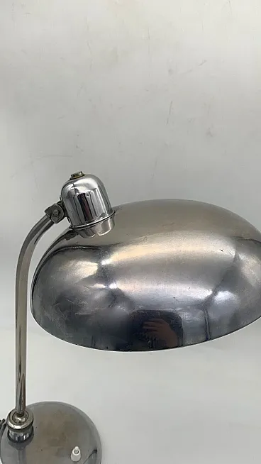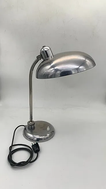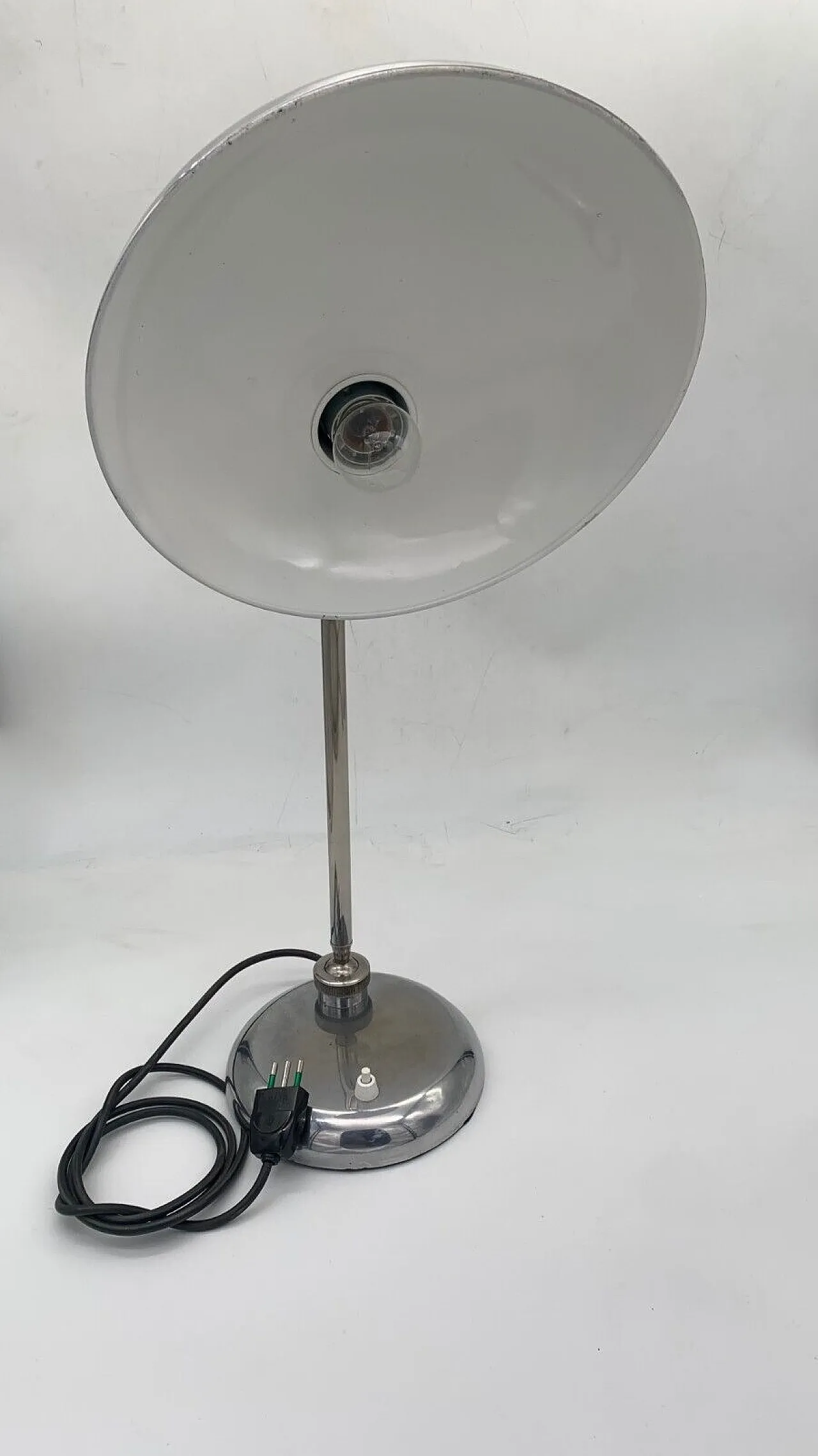 Questa lampada da tavolo direzionabile è realizzata interamente in ottone cromato, con un design elegante e funzionale dal gusto industrial-vintage. La struttura è composta da una base circolare solida e pesante, che garantisce stabilità, da cui si sviluppa uno stelo curvo che sostiene il paralume semisferico orientabile.
