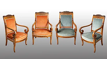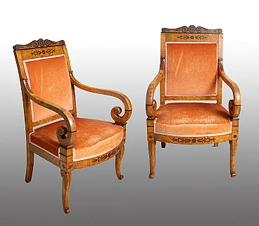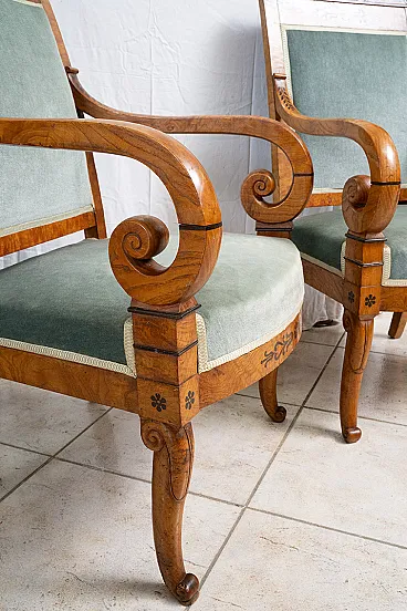 Coppia di poltrone antiche Carlo X in radica di olmo e amaranto. Franc