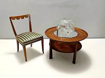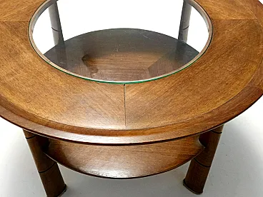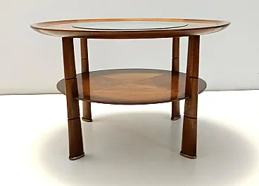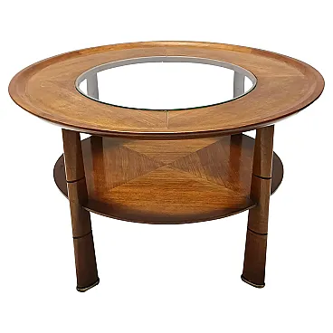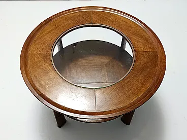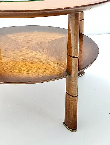 Made in Italy, 1940s. This is a high-quality solid walnut coffee table. The top is slightly concave with a crystal top in the center. Its legs are distinguished by their conical oval section with grooves that enrich the decoration; its feet caps are made of solid brass. The underlying surface is characterized by a veneer composed of four triangles that meet perfectly in the middle. We attribute it to Paolo Buffa as it is part of a furniture with several pieces by Paolo Buffa, furthermore the conical oval section legs are a solution that Buffa used in some of his furnishings. This is a vintage item, therefore it might show slight traces of use such as its original patina, but overall it can be considered as in excellent original condition and ready to become a piece in a home. Measures: Diameter: 79 cm Height: 51 cm. Lower shelf diameter: 64 cm Height to the first shelf: 25 cm Order it now! We sell the best quality pieces and we offer an amazing service: if it's not during night time, we answer within 2 hours and we absolutely love to follow every step of the purchase and even after. As matter of fact we really appreciate our customers’ feedback and when we receive pictures of our pieces in their new homes. We assist you during the process and answer all your questions. In addition to this, we always review the pieces before shipping, so that you receive the goods at its very best. We provide the best possible quotes and professionally and carefully pack the items. Insurance is included. And if there is any issue, it is our mission to make so you don't have to worry: we will always be there for you to assist in any way possible.