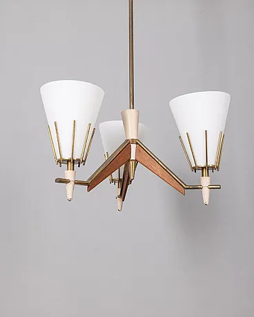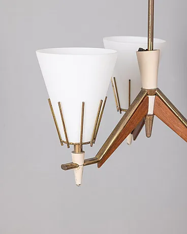 Lampada a sospensione in legno e vetro opalino, anni '50